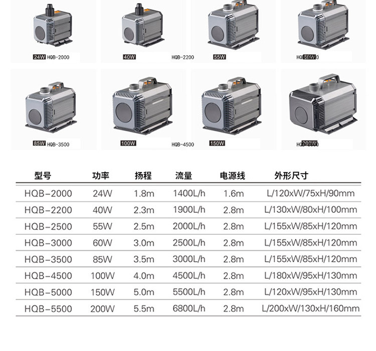 HQB2000 Flow 1400 Power 24wHQB2200 Flow 1900 Power 40wHQB2500 Flow 2000 Power 55w