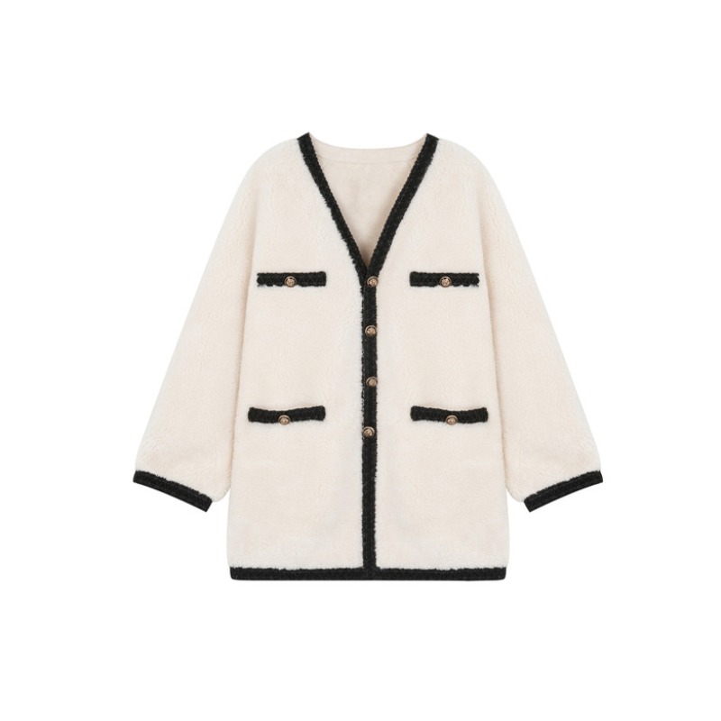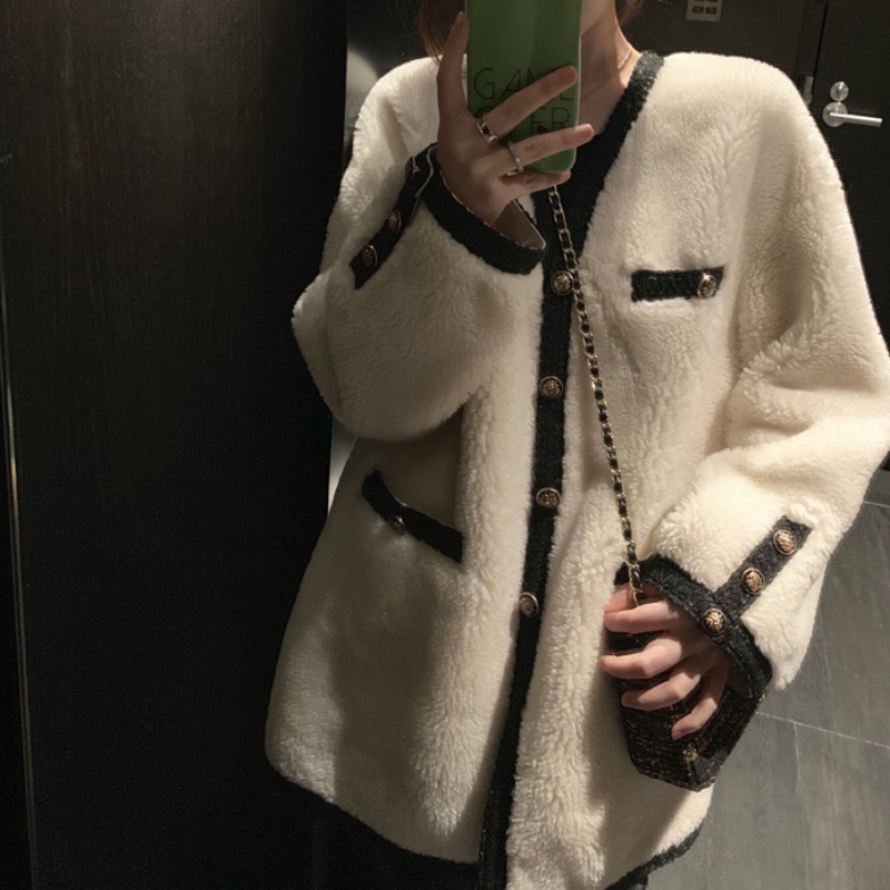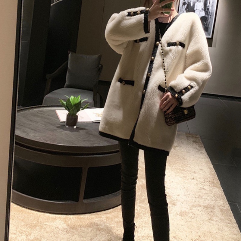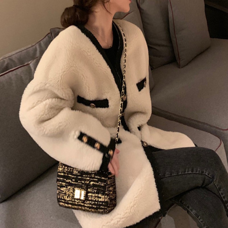 2022 new small scenographic wind white lamb wool coat female winter medium long version Korean version of the Han version with loose 100 lapped thicken