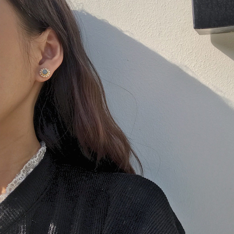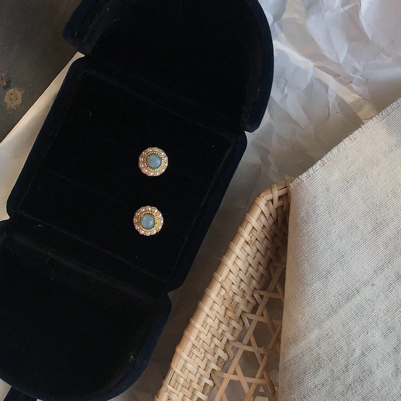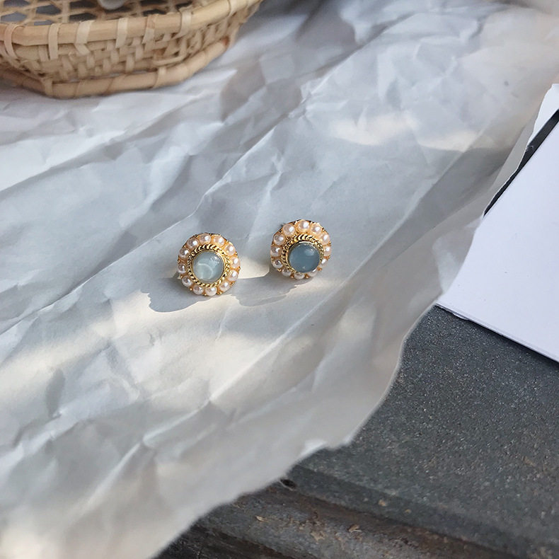 s925 silver needle Korea Dongdaemun Law style retro small crowdsourced earrings French style warm and light blue pearl earrings 050