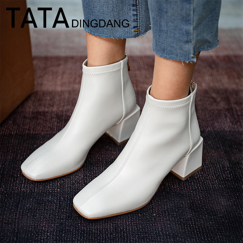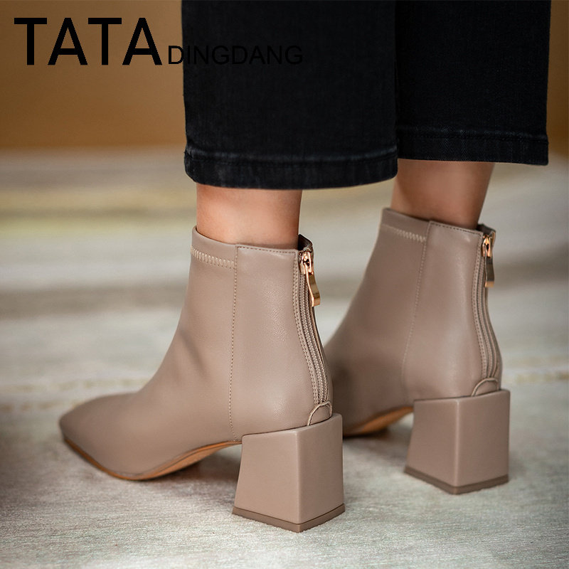 TATA DINGDANG square head coarse heel short boots women genuine leather high heel elastic boots and ankle boots on her female shoes single shoes