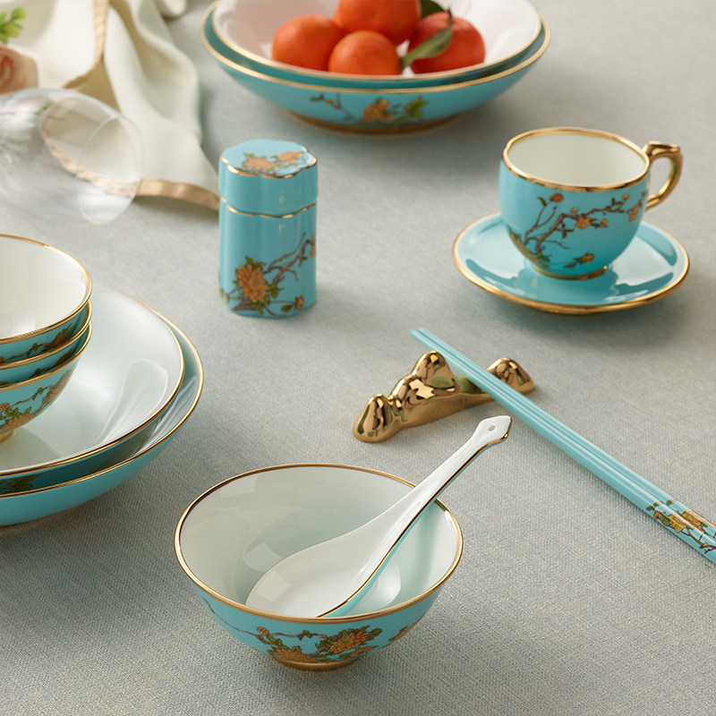 Auratic Yongfeng Source Madame Porcelain West Lake Blue 46 Head Chinese Tableware Set Group Home ceramic Bowl Dish Spoon