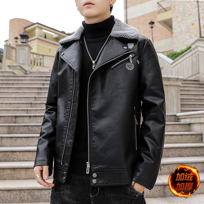 Fashion brand autumn and winter leather men plus velvet leather jacket trend thickened winter motorcycle clothes men's leather u jacket handsome ins