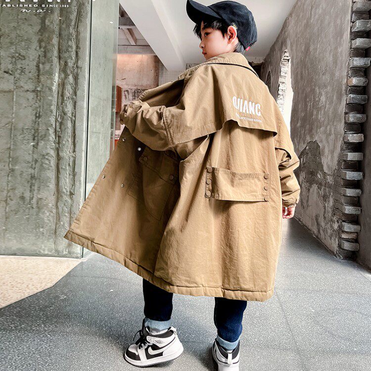 Boys long windbreaker jacket 2022 autumn style Western style medium and long version spring and autumn thickening medium and large children's knee-length winter clothing plus velvet