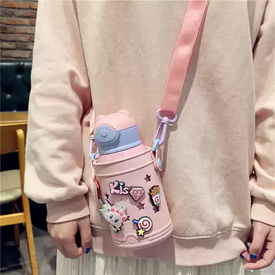 Messenger thermos cup female ins primary school student with straw double cover thermos pot Children's cute high face value hole water cup
