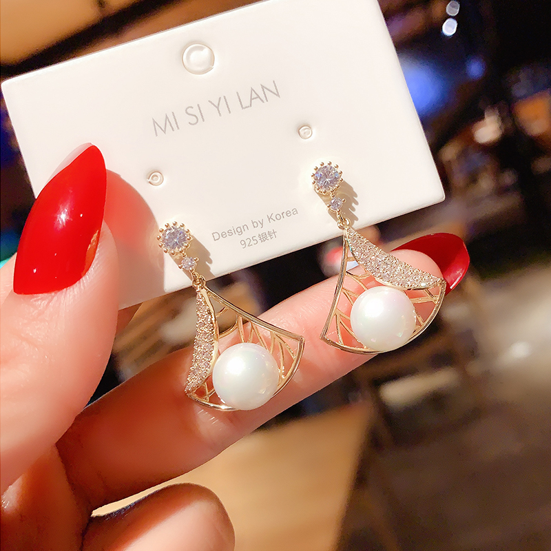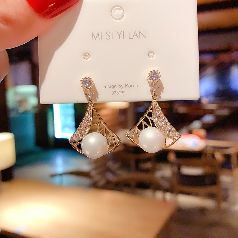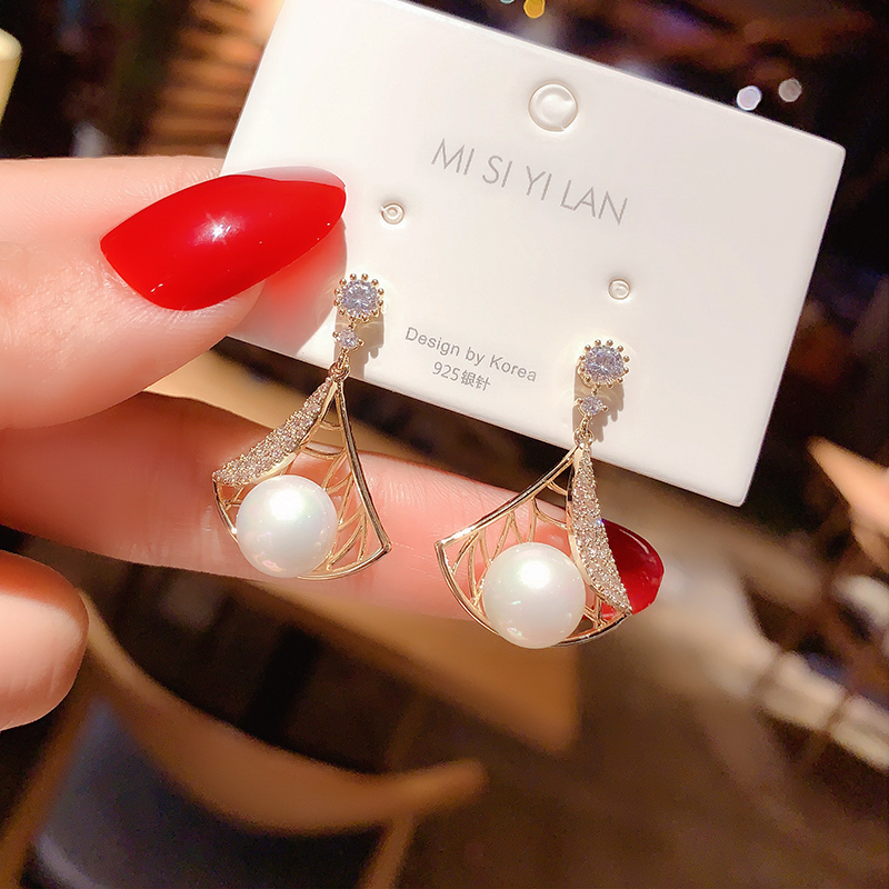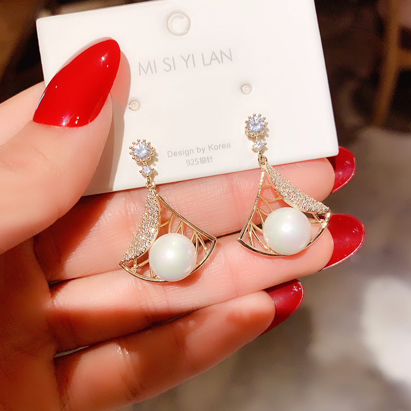 Korean design fan-shaped pearl earrings temperament net red high-end ear needle 925 silver needle earrings personality ear clip