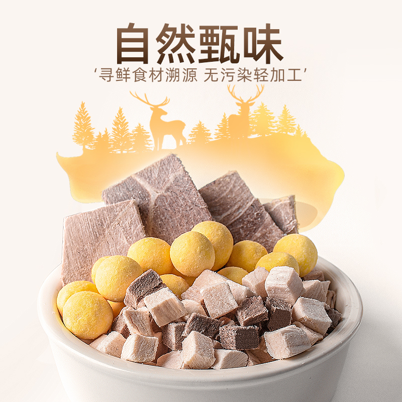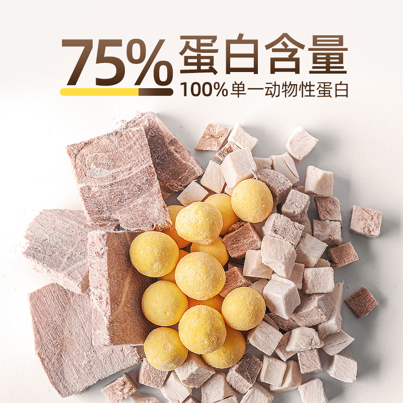 Chicken freeze-dried - 60g Duck freeze-dried - 50g Beef freeze-dried - 45g Venison freeze-dried - 45g quail egg yolk - 100g Mixed flavor (chicken duck meat
