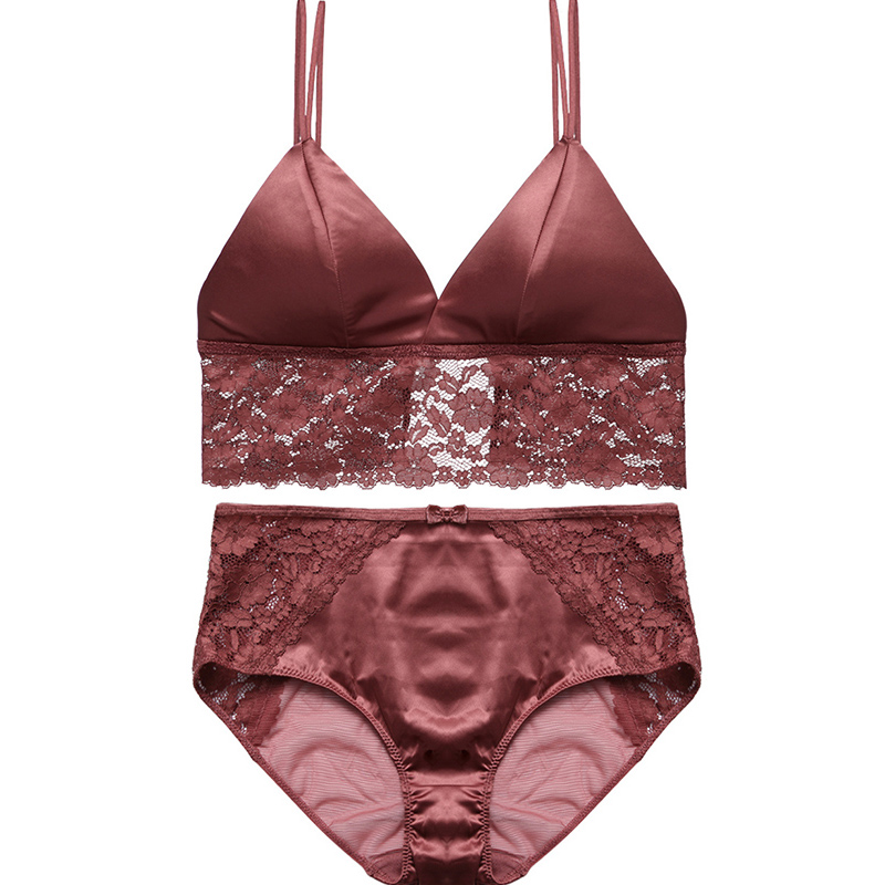 Women's bra thin cotton sexy lace simple smooth deep V without rims beauty back mid-low waist underwear set Autumn and winter