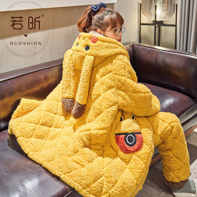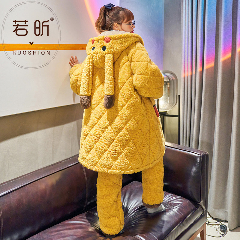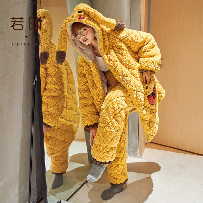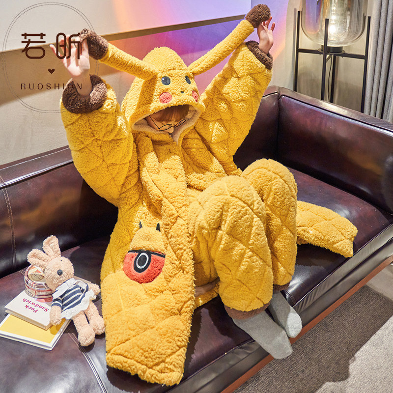 Coral Suede Pajamas Woman Autumn winter paragraph Thickened Triple Clip Cotton Warm Sleeping Robe Suit Cute Flannel Sumpsuit