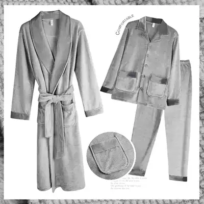 Island velvet men's pajamas three-piece set spring and winter thickened warm long version coral velvet robe home clothing bathrobe