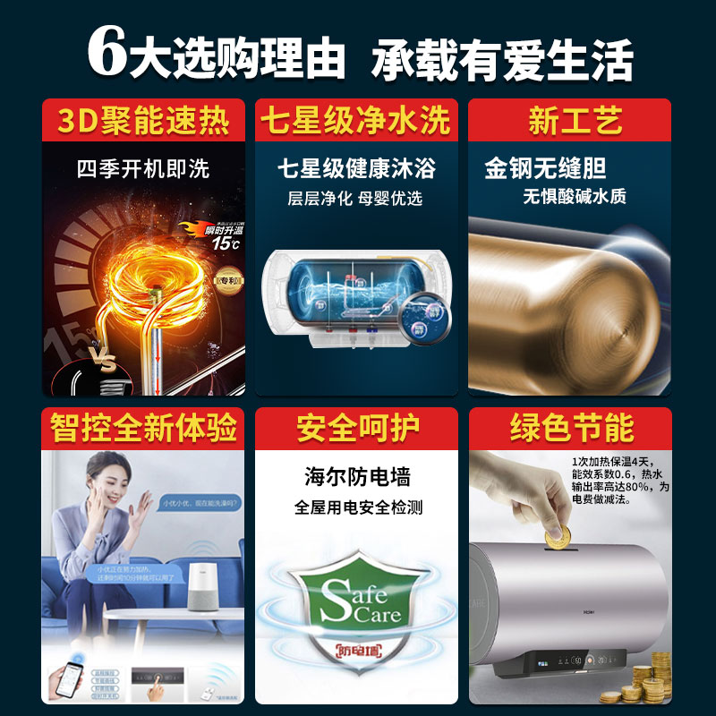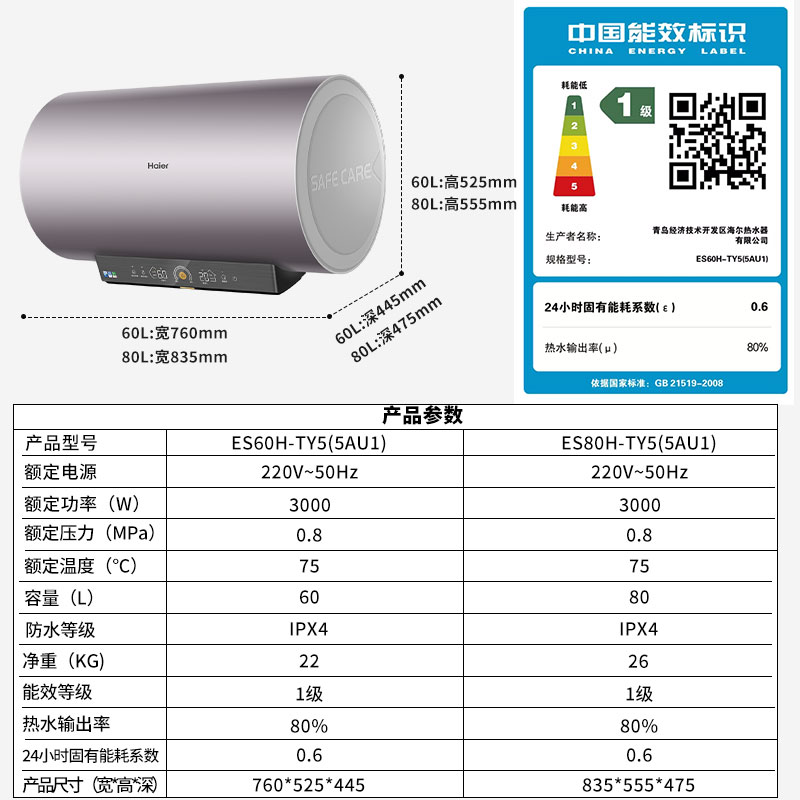 Haier ES60H-TY5 (5AU1) electric water heater 60 liters 80 liters 1st level frequency conversion 3D speed hot seven stars Net water wash
