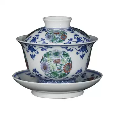 Zhongjia kiln bowl Jingdezhen blue and white bucket color firewood kiln tea three Cai bowl full handmade tea set large group chrysanthemum pattern