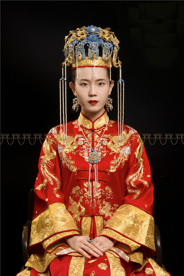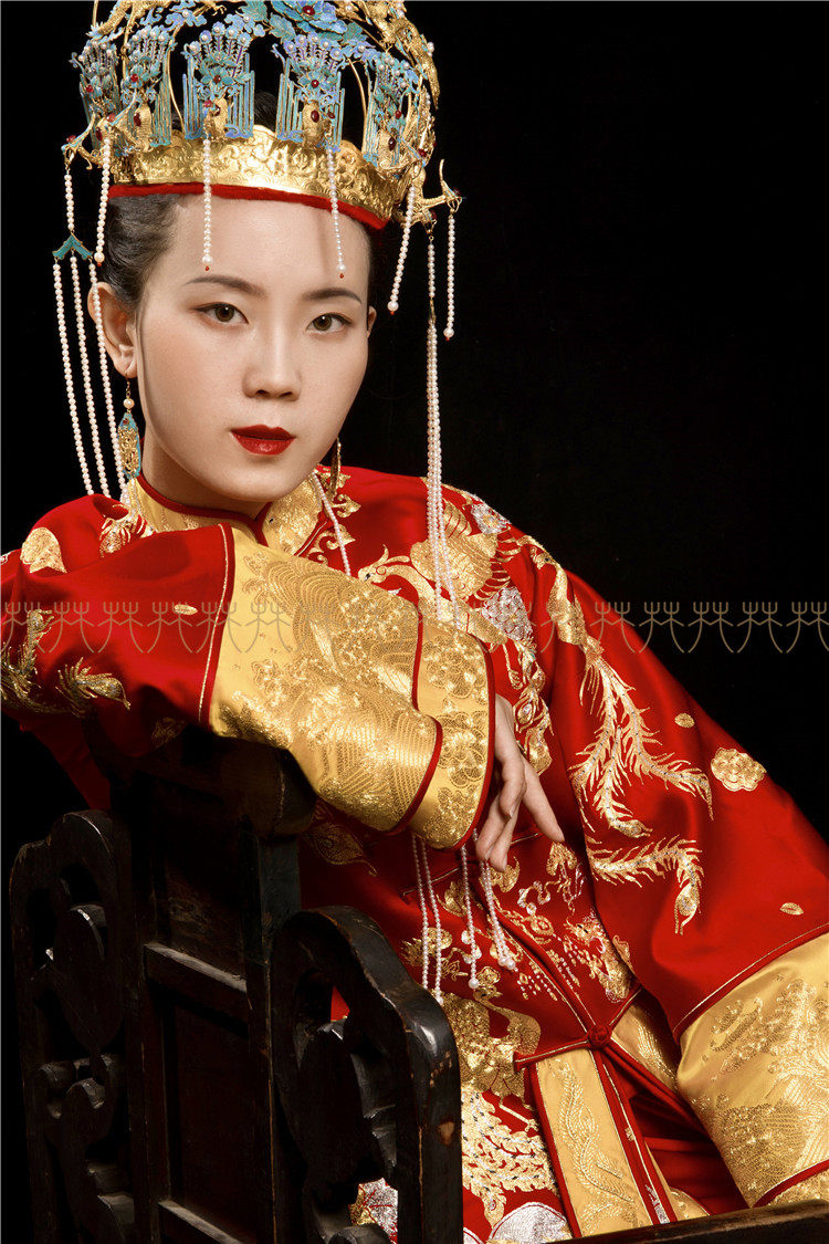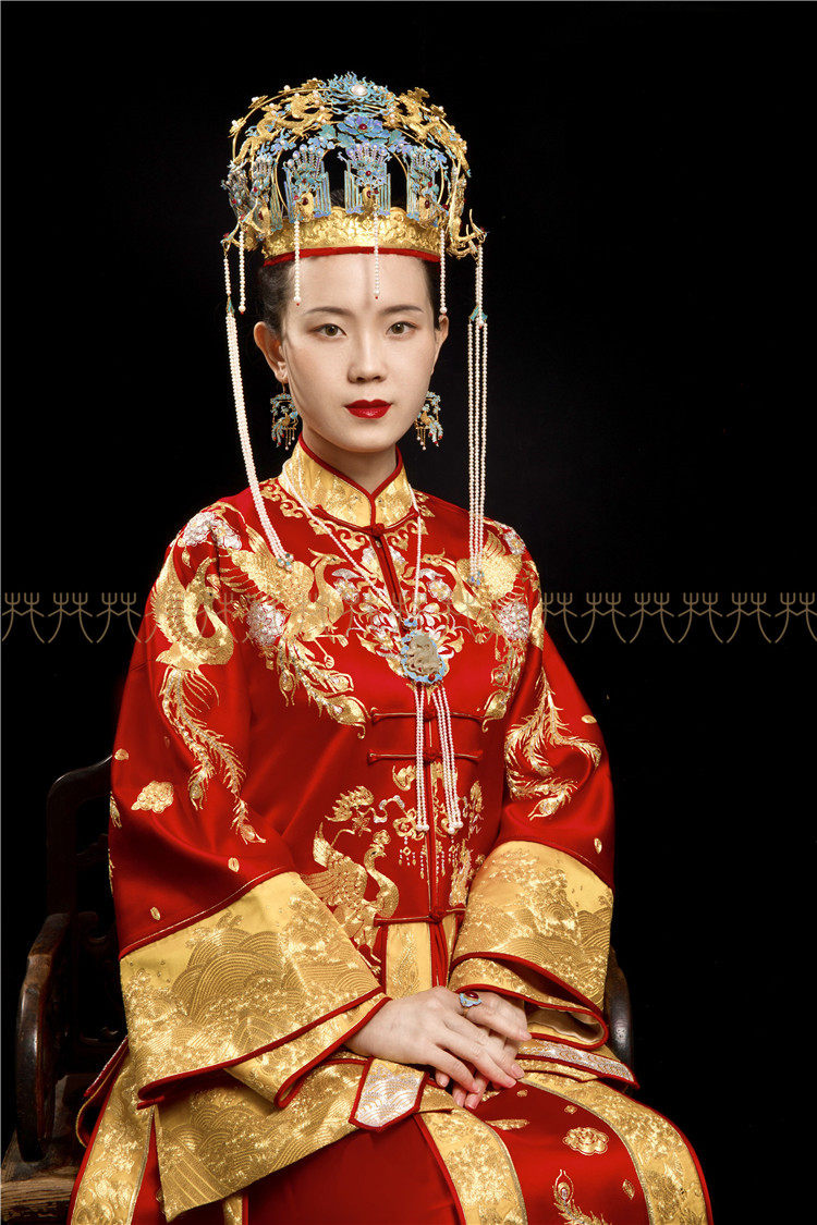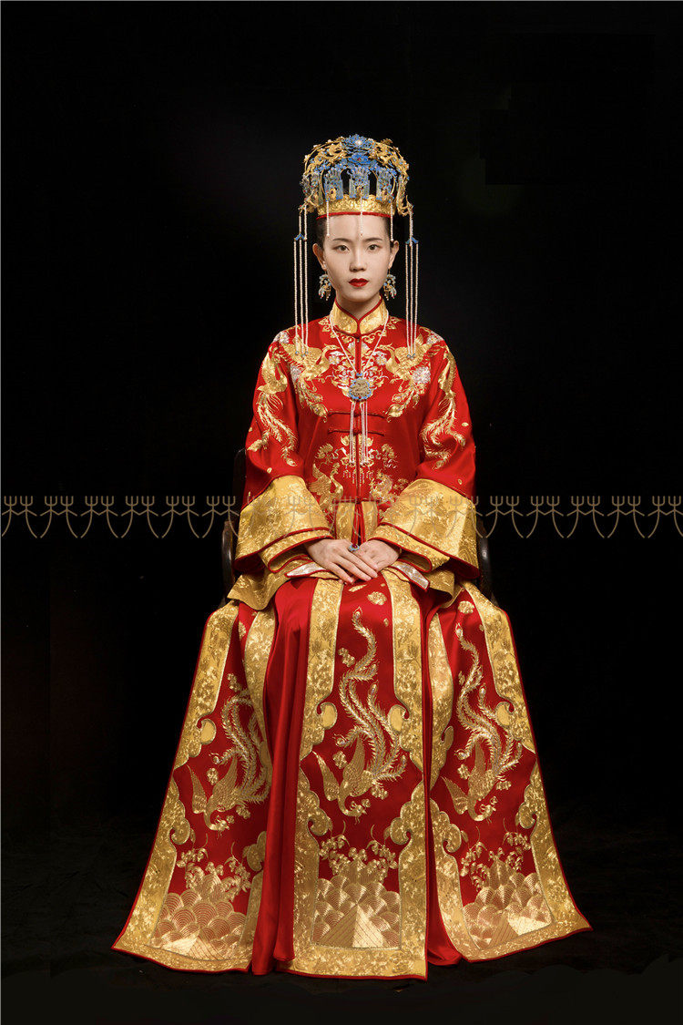 Huffin Bride's Cloisters and Tinnitus With Four Horseface Skirts Show and Handmade Pan Gold Embroidery for the Qing Han women's clothing