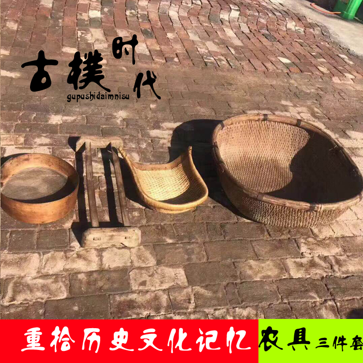 1 Bamboo basket 2 sieve 3 Wooden basin 4 Wooden bucket 5 Dustpan 6 Hat 7 Wooden bucket 8 Old rice liter 9 Dust basket 10 Bellows 11 Demoiselle 12 Corn thresher 13 Wooden plow