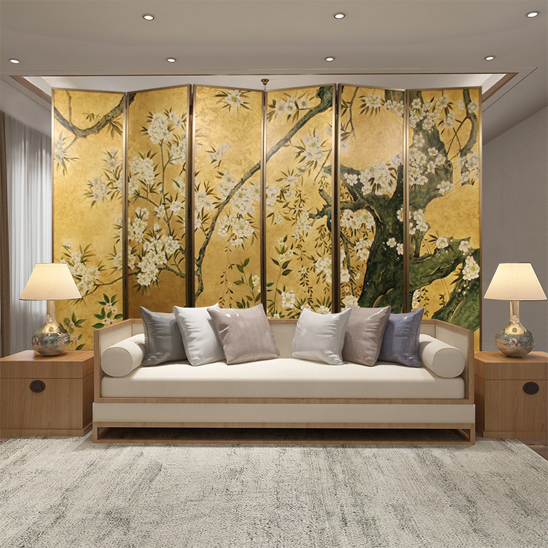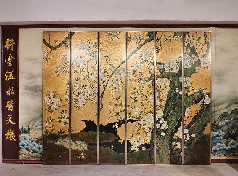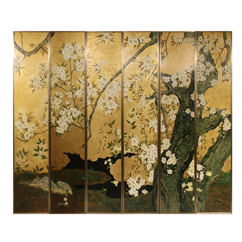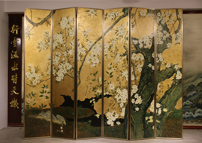 New Chinese-style hand-painted gold leaf flower and bird screen partition mobile hotel home entrance living room decoration cherry blossom picture customization
