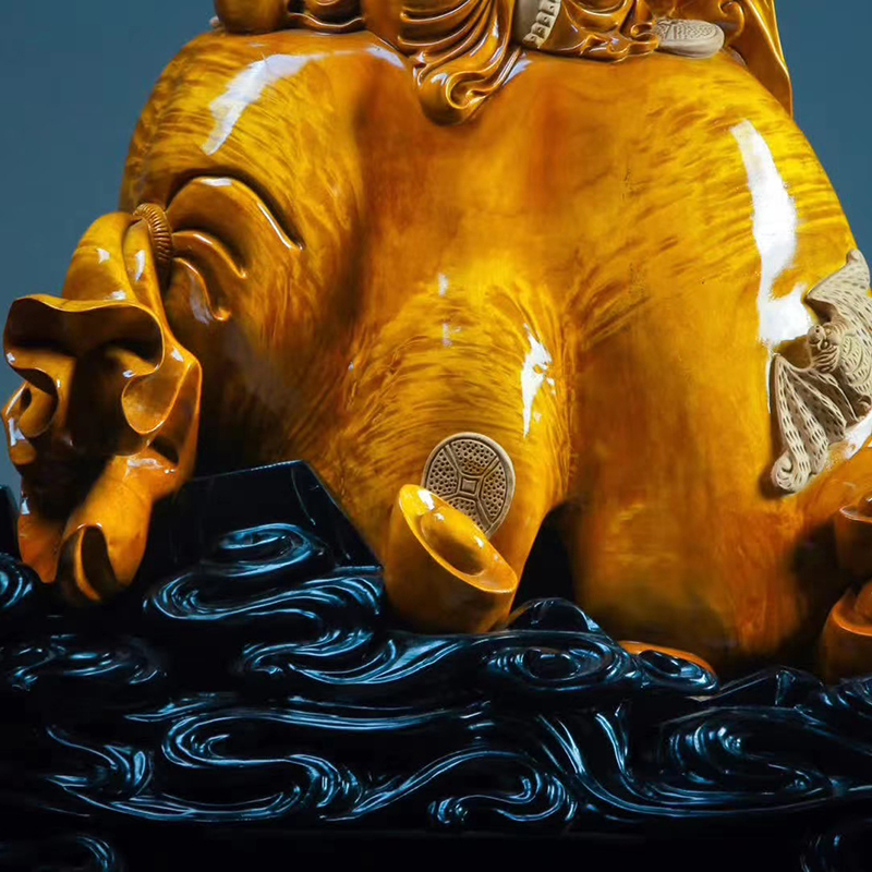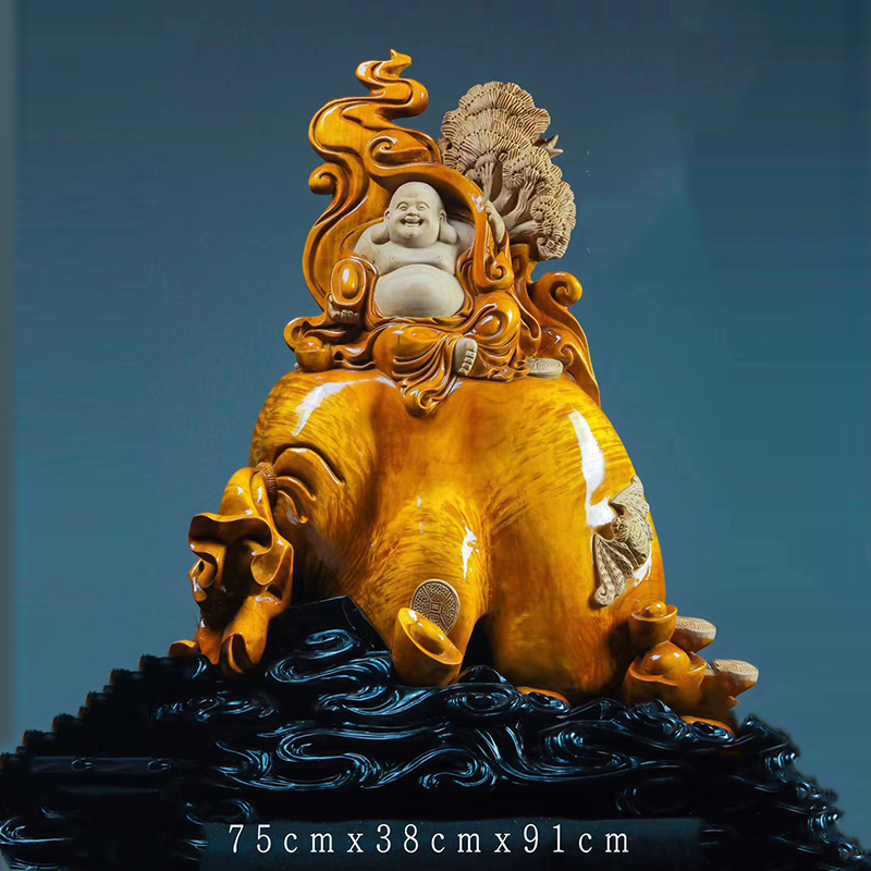 Golden silk nanmu root carving Maitreya Buddha laughing Buddha lucky Buddha home decoration small leaf Zhennan water ripple carving craft gift decoration