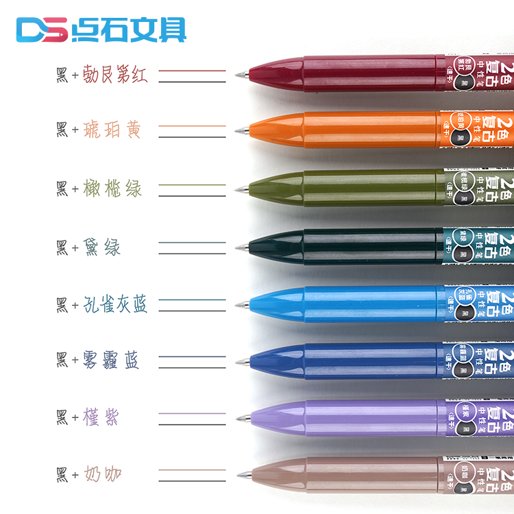 1 bicolor pen (degreen black) 1 bicolor pen (amber yellow black) 1 bicolor pen (olive green black) 1 bicolor pen (Burgundy red black) 1 bicolor pen (milk curry black) 1
