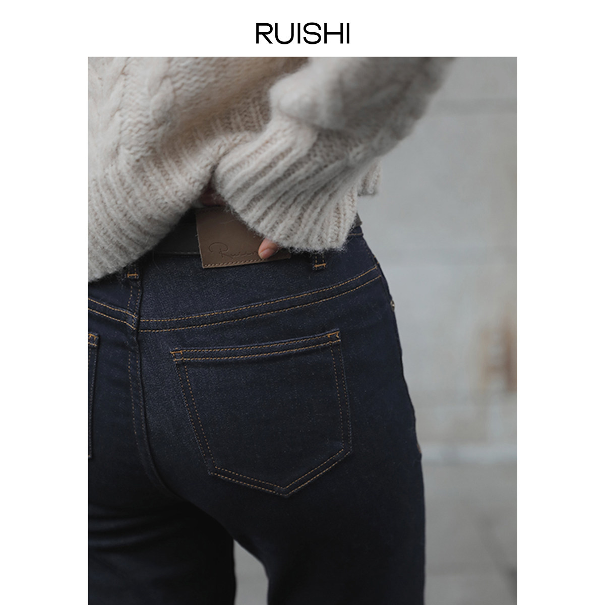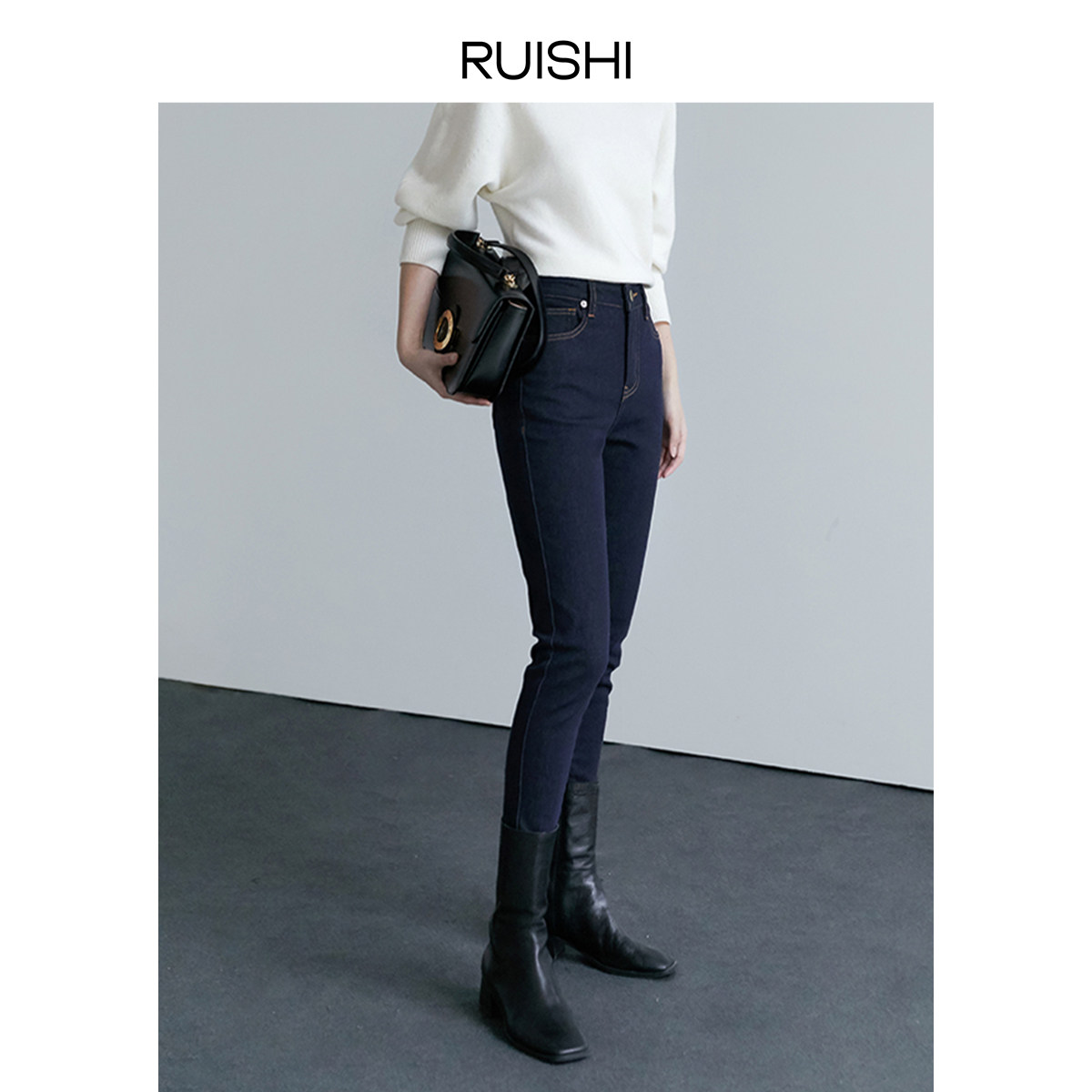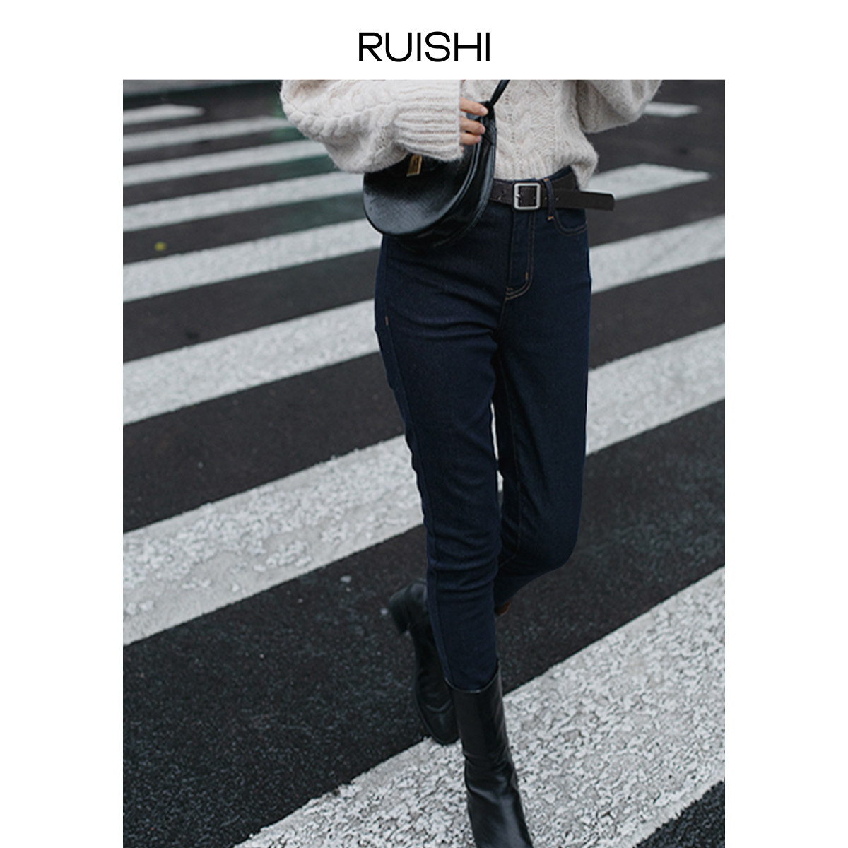 Ruishi non-fading raw cow brushed fleece micro-elastic slim fit slim feet jeans women's spring and autumn boots pants nn P8
