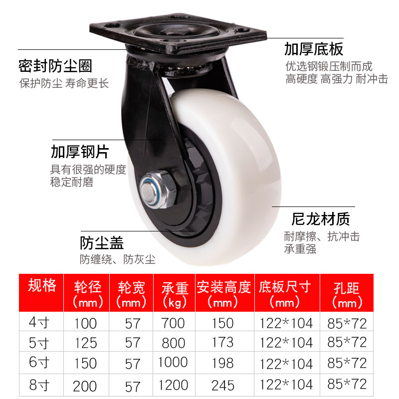 Heavy-duty 4-inch universal wheel 5-inch directional wheel 6-inch brake wheel equipment wheel 8-inch high-load nylon wheel 1 ton