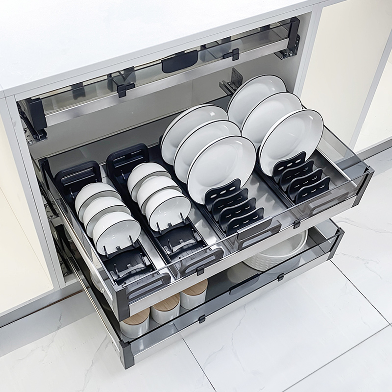 Kitchen cabinet pull basket with drawer built-in crockery tray rack adjustable countertop storage drainage shelf