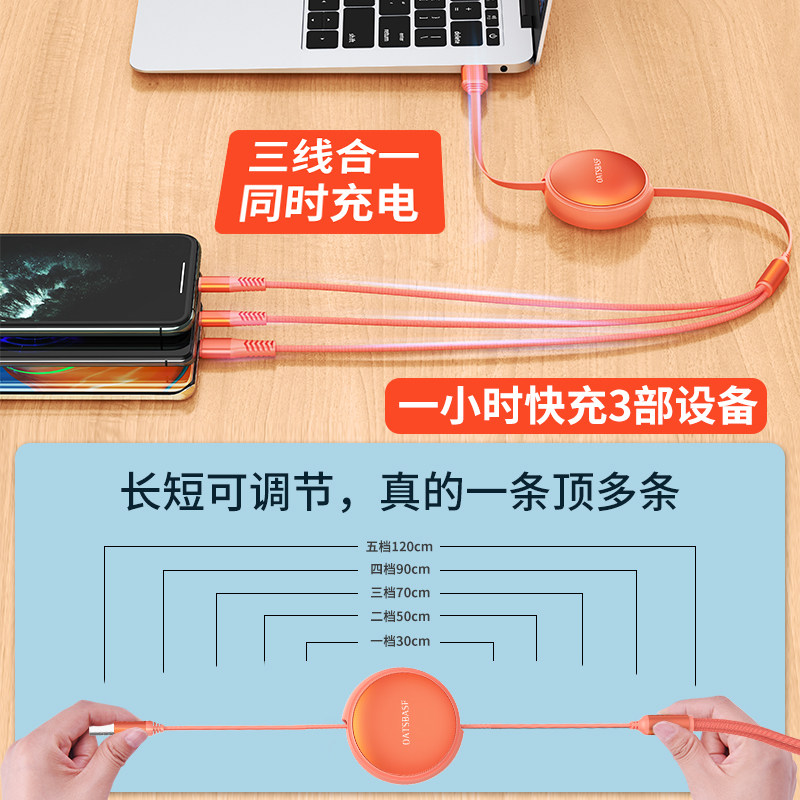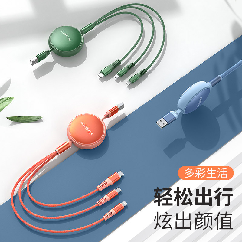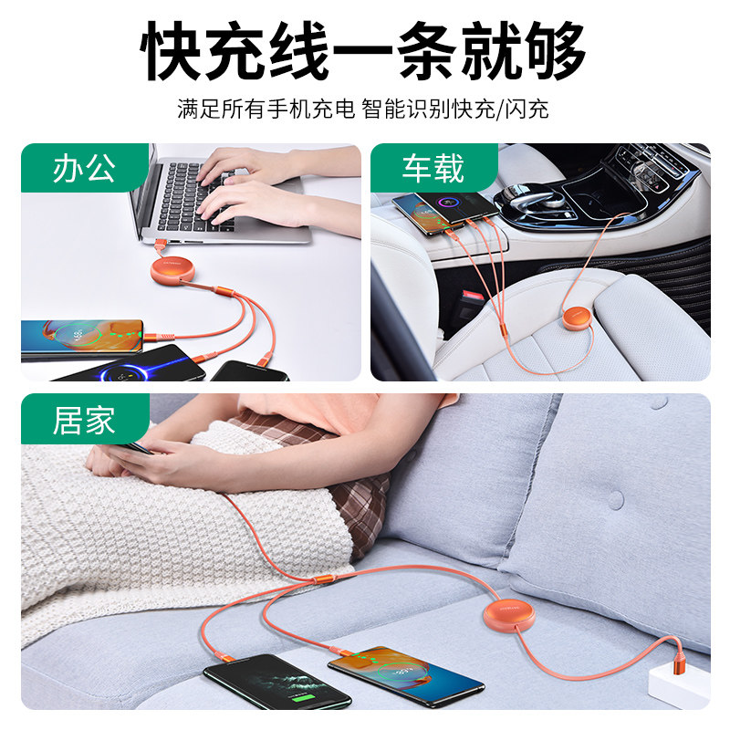 Data line three-in-one charger One drag triple telescopic mobile phone Fast charge suitable for Apple 6s Android Huawei Xiaomi iPhone12 onboard flash-charging multipurpose three-wire multi-head functional all-purpose three-use