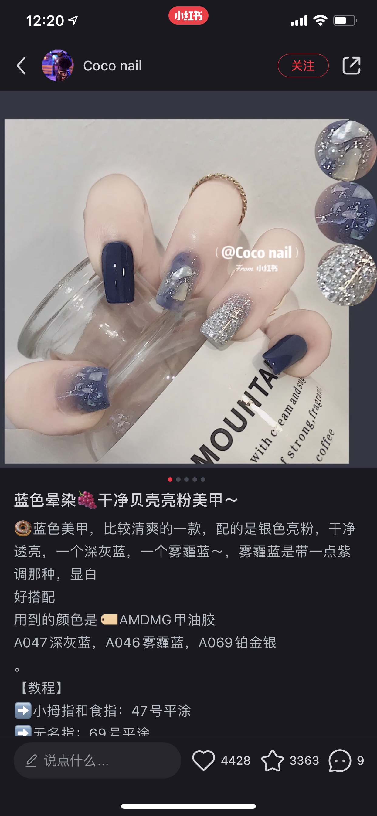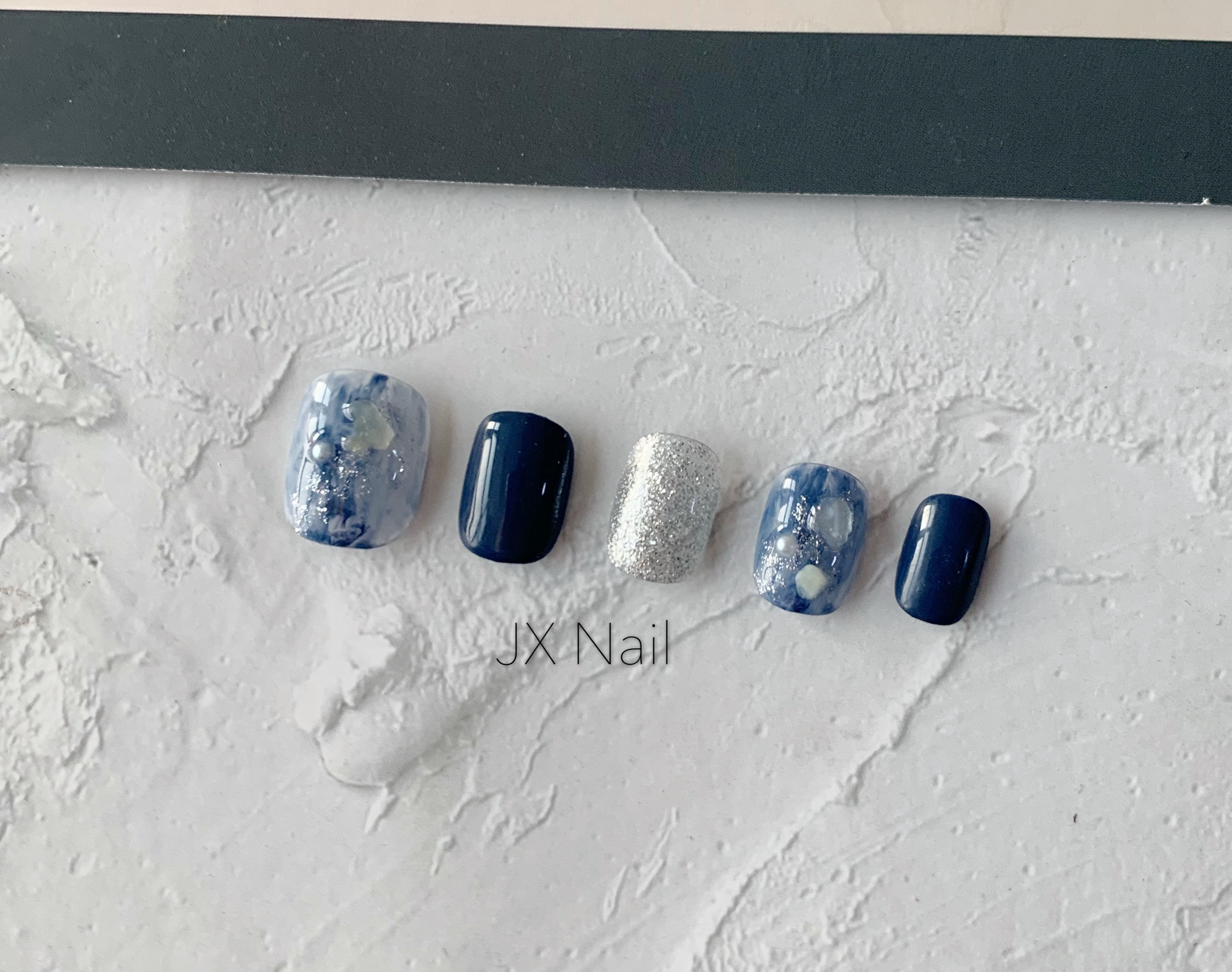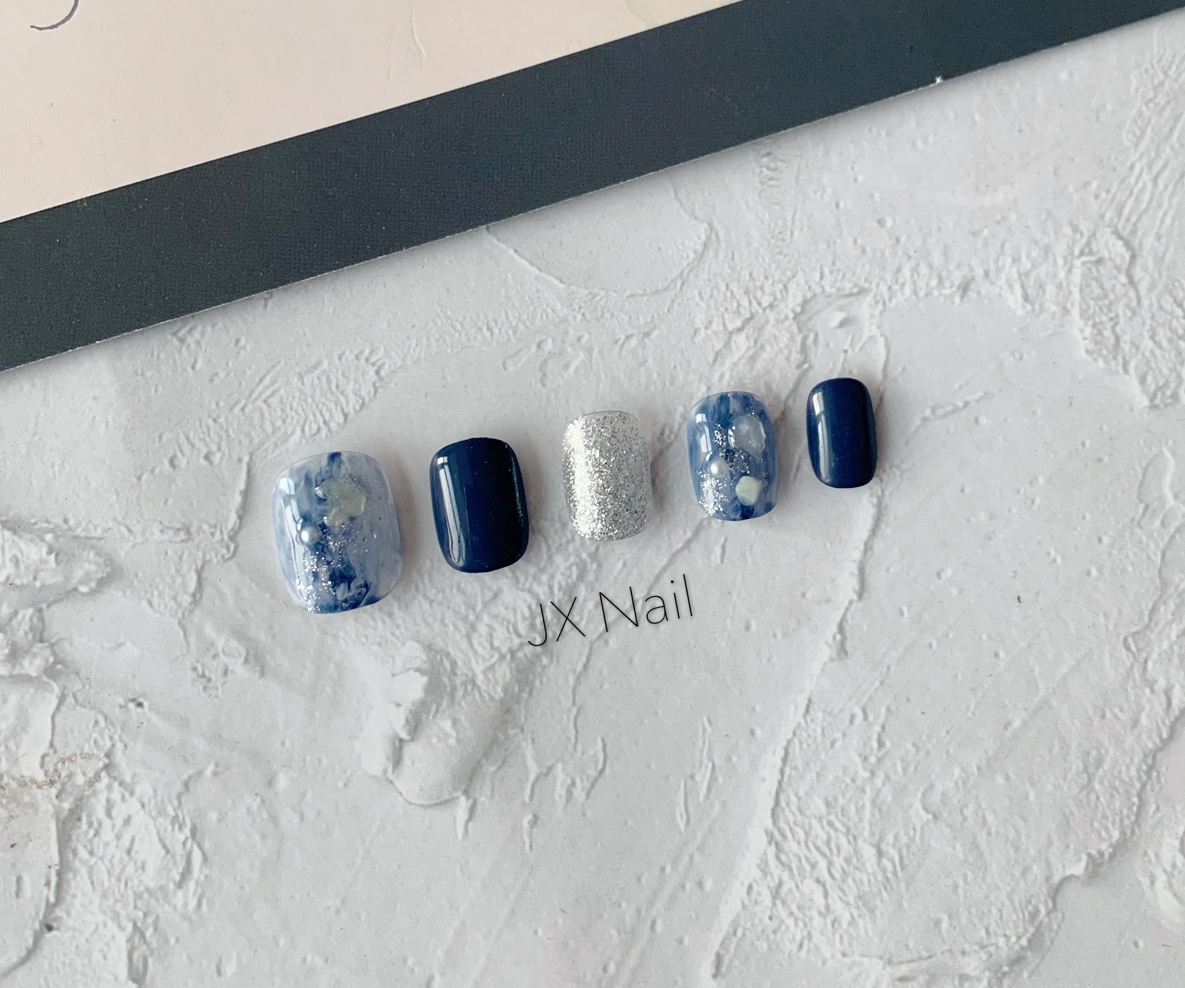Xiaohongshu manicure sheet finished blue smudged shell bright powder handmade phototherapy wearing nail false nail stickers white short