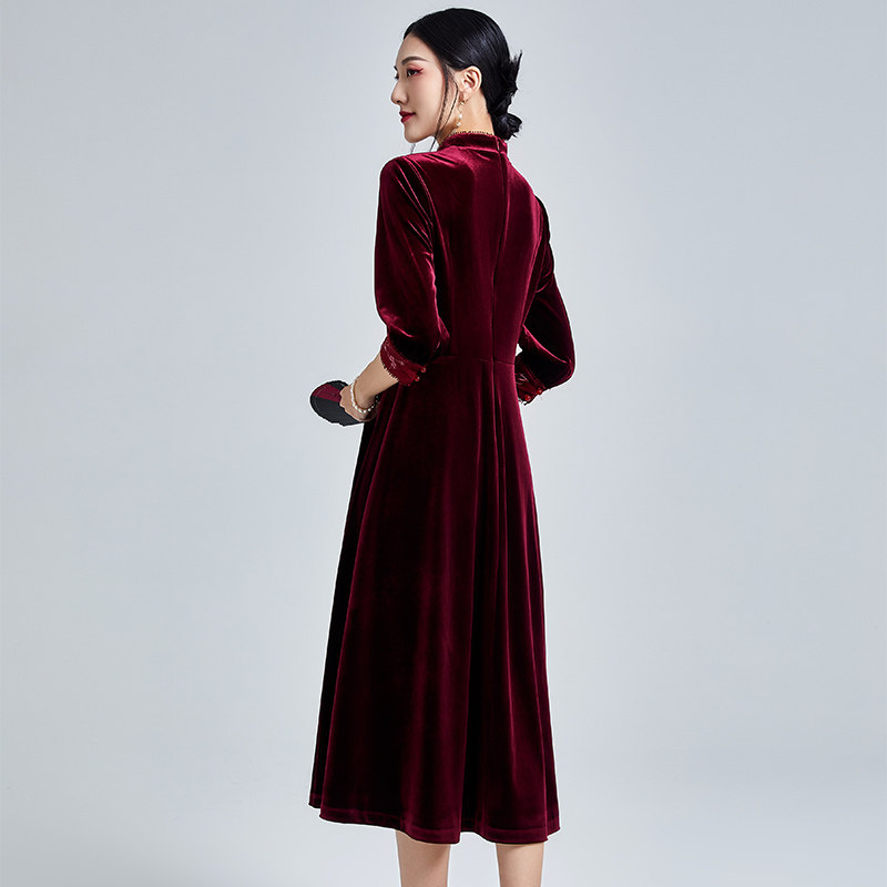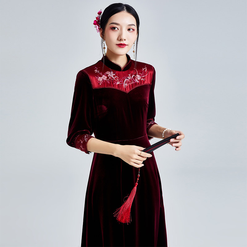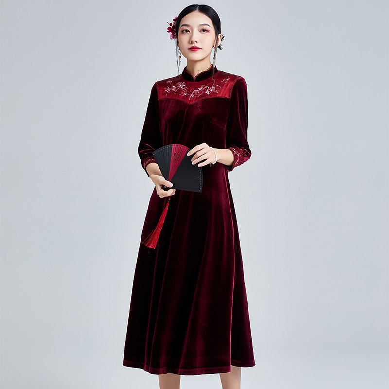 Strangeness 2022 Spring Summer's new Chinese wind retro embroidery to improve the long version of the foreign dress in a velvet improved qipao