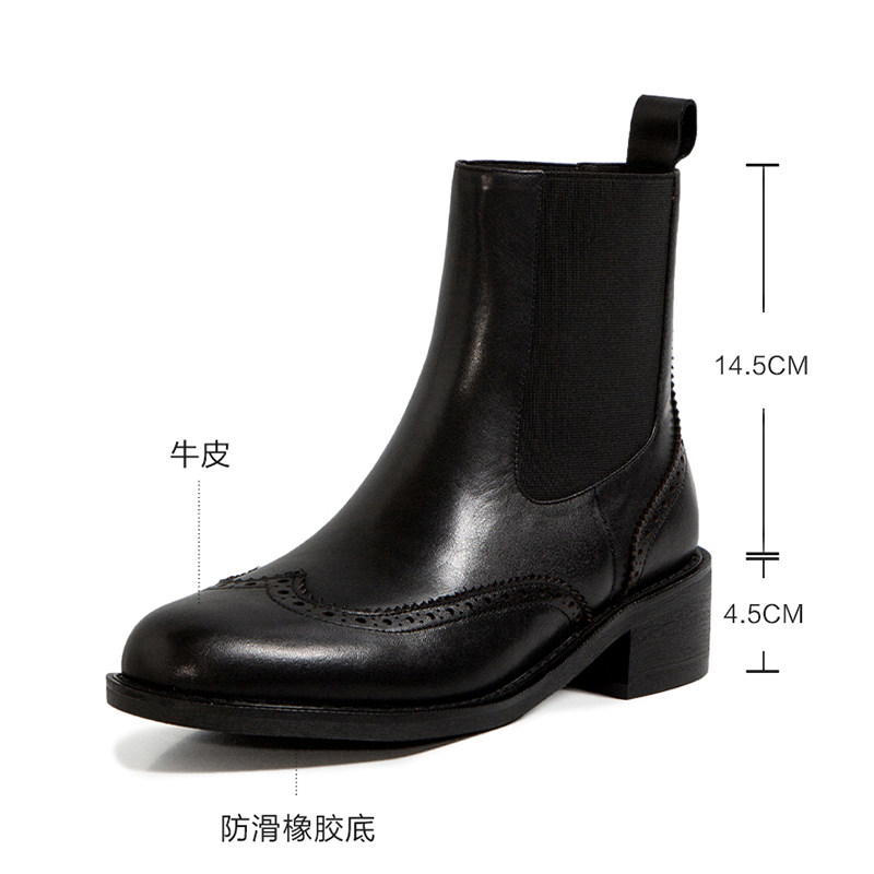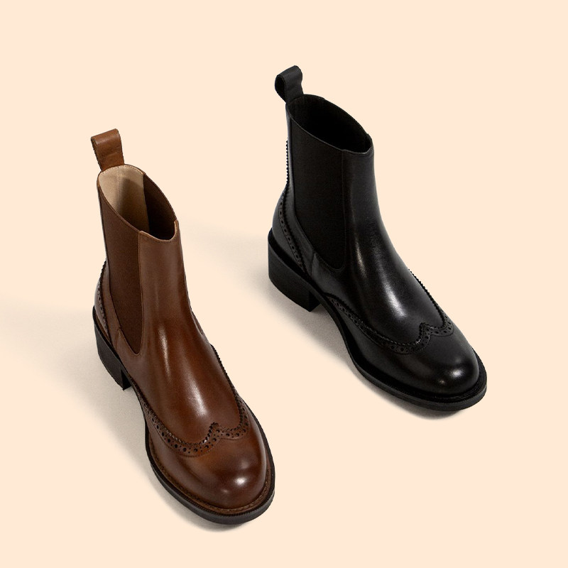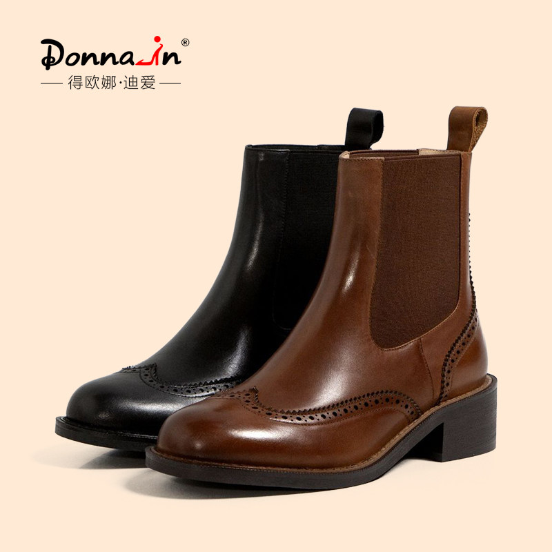Deona Brown Bullock Middle Heel Chelsea Short Boots Women's First Layer Leather Thick Heel Retro British Style Martin Boots