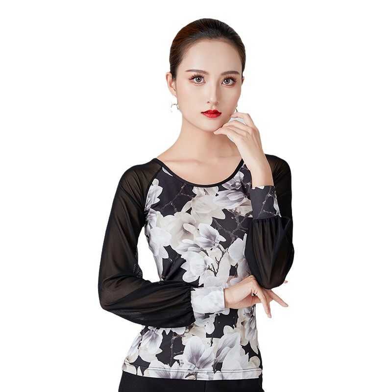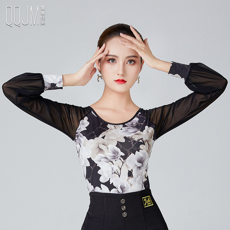Qingqing Jiamei's new ice silk training suit slim fit pattern modern dance top women's national standard dance print long-sleeved round neck