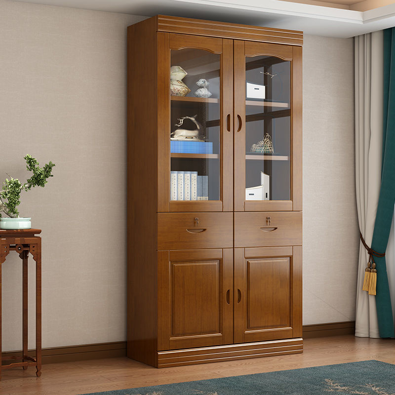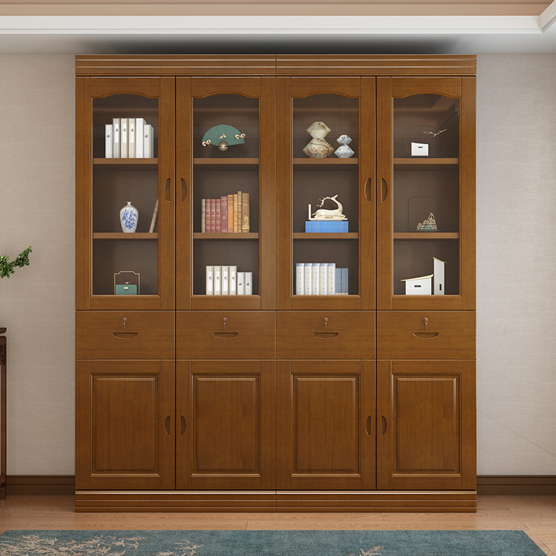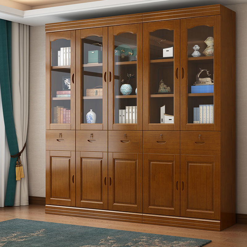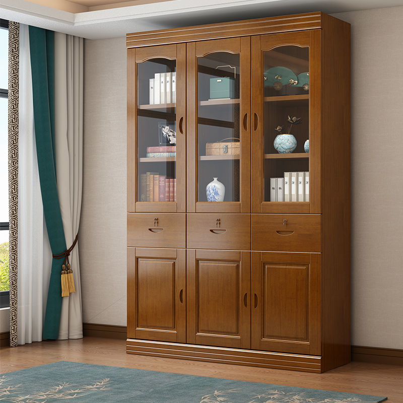 Solid wood bookcase with lock with glass door on floor group Family with 3 doors Modern Chinese office Three doors bookcase with door