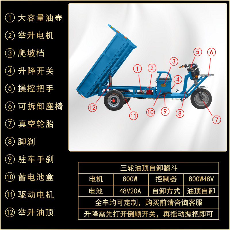 Electric dump three wheel pull truck hydraulic top dump dump truck is pouring cargo truck