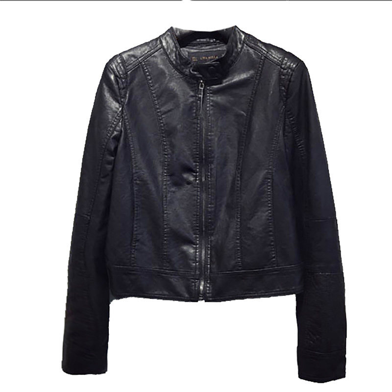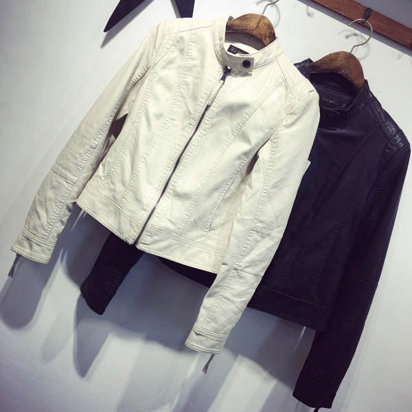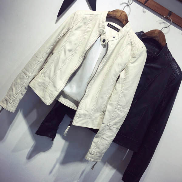 Korean beige small leather jacket women's spring and autumn thin new long-sleeved black stand-up collar short leather motorcycle jacket