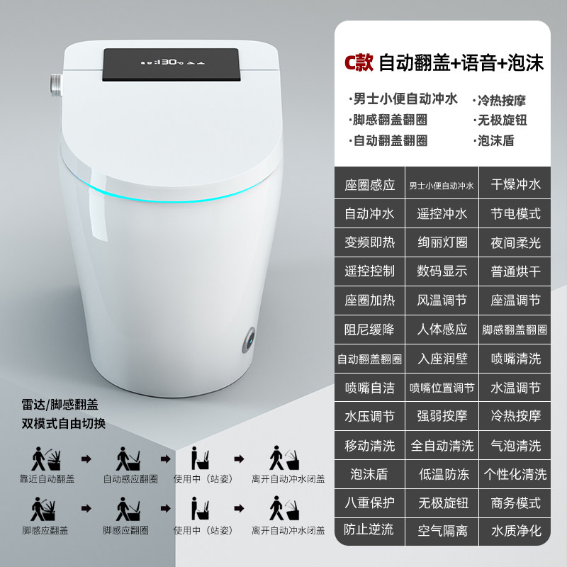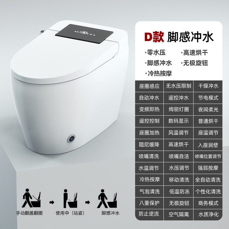 With water tank D + standard + manual flap foot sense flushing belt water tank E + upgrade + automatic clamshell automatic flushing belt water tank F + deluxe + full automatic + voice + foam no water tank A + standard + manual flip foot flushing no water tank B + upgrade + automatic flip cover automatic flushing no water tank C + deluxe + full automatic + voice + foam