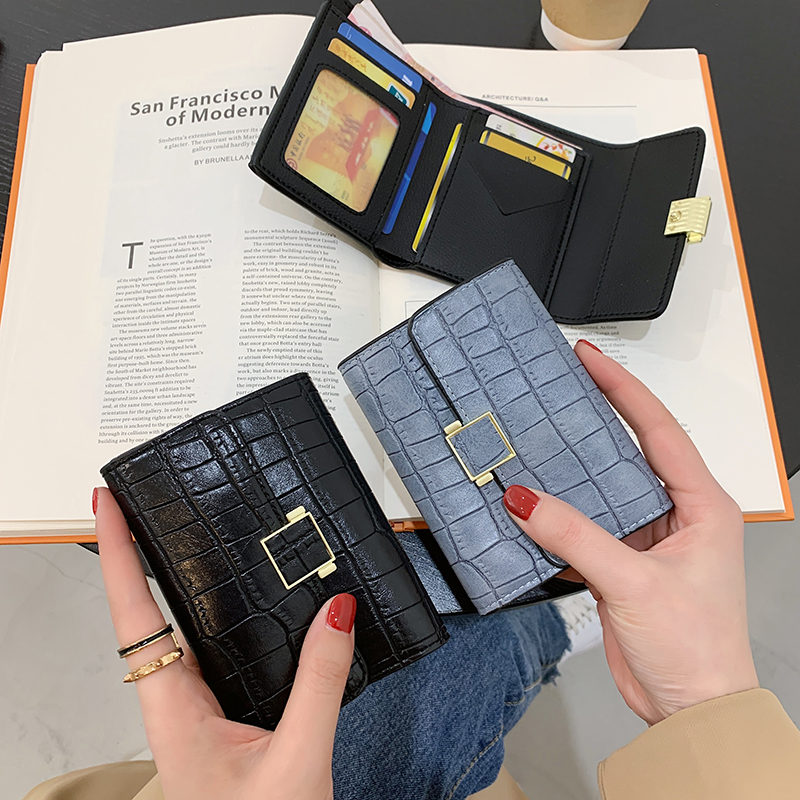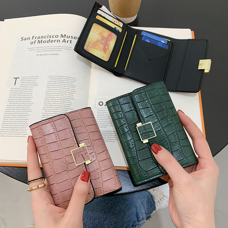 Small wallet Women in short Korean version 2021 New fashion Crocodile embossed buckle zero wallet Three-fold laminated card bag tide