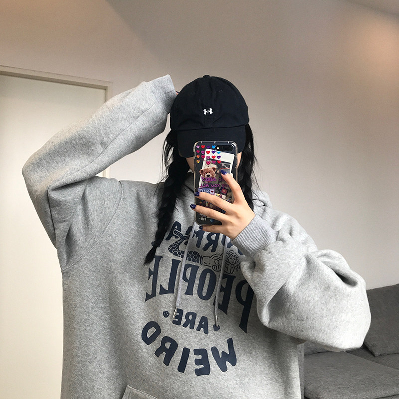 Wang girl's shop hooded sweatshirt 2022 new spring and autumn gray plus velvet loose Korean version bf all-match coat
