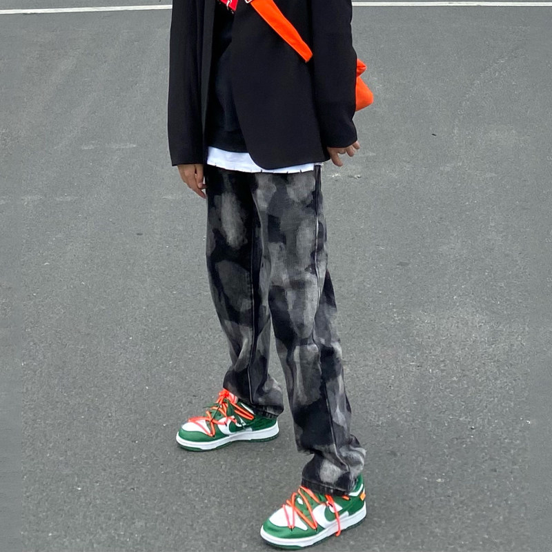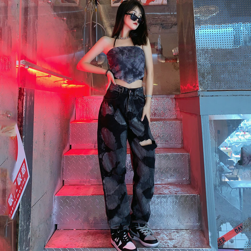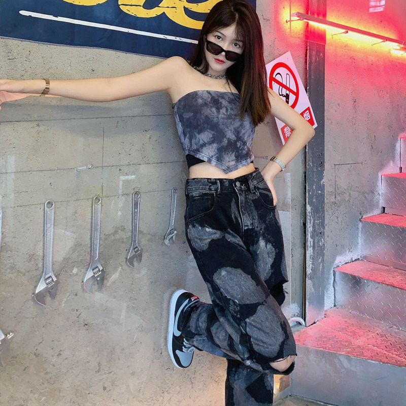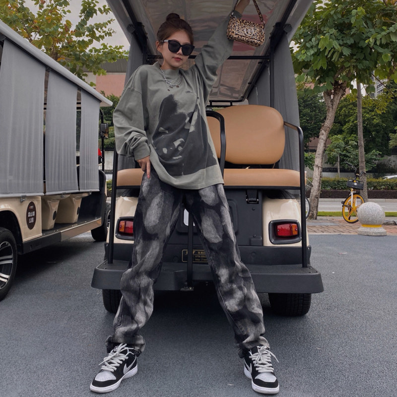 Dark country tide tie-dye jeans women's 2022 new spring and autumn straight loose high waist slim dark trendy trousers
