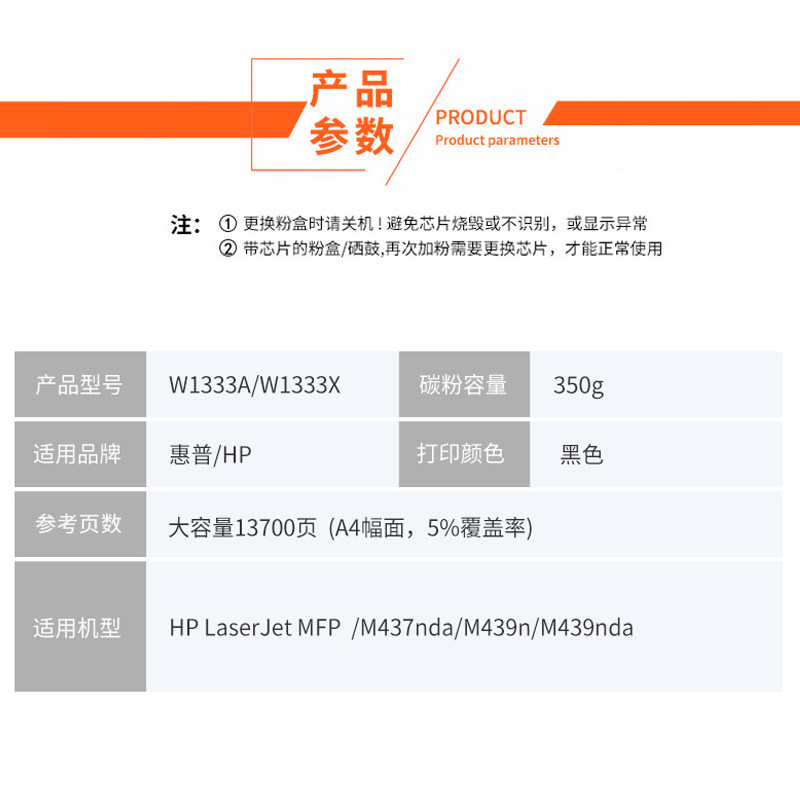 W1333A standard capacity powder box (140 gr about 4800 pages) without chip W1333A plus (360 gr about 13700 pages) without chip large capacity powder box W