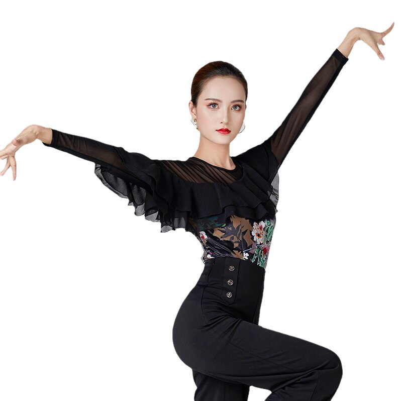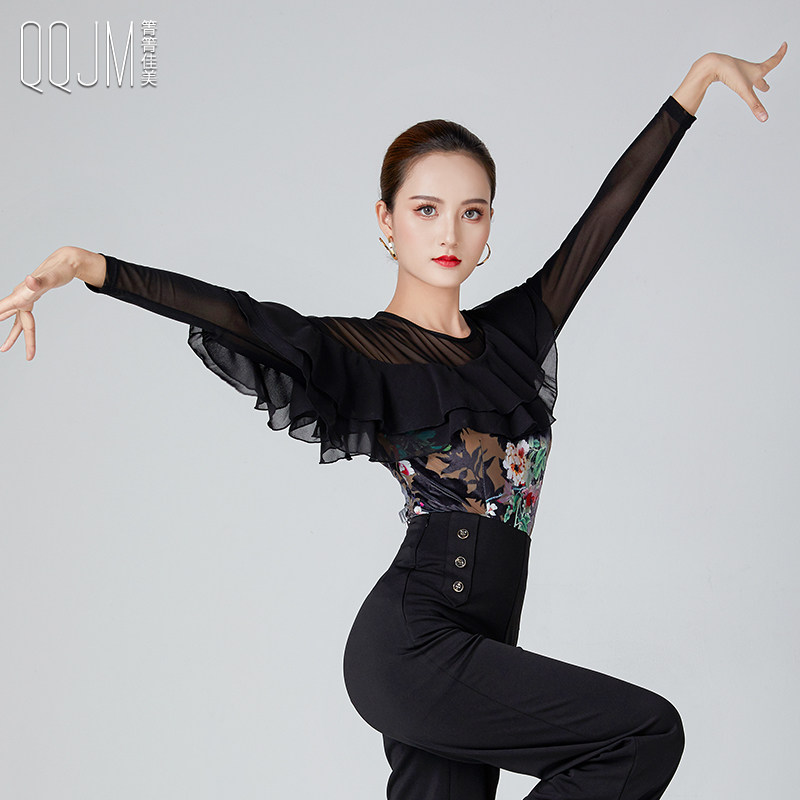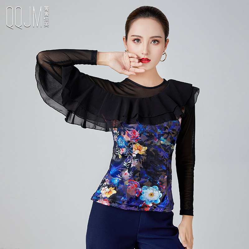 Qingqing Jiamei's new modern dance top women's ruffled long-sleeved slanted collar printed velvet square dance practice clothes