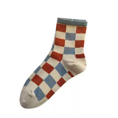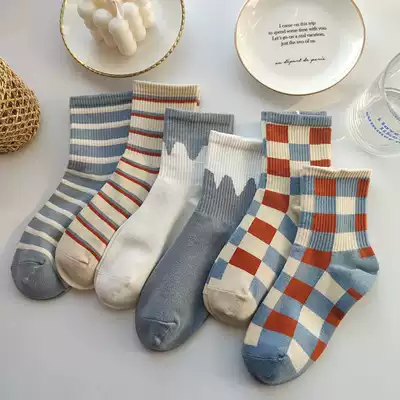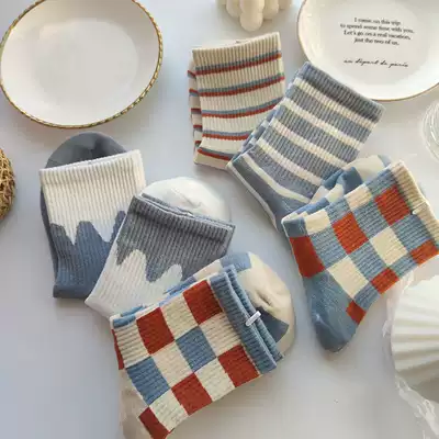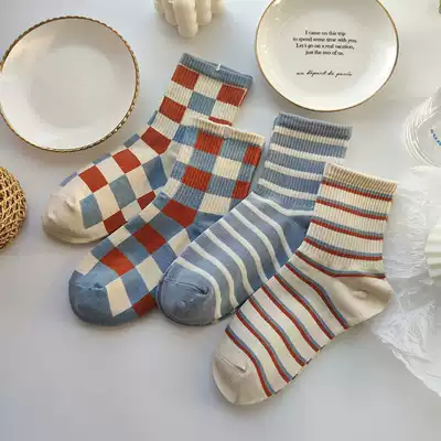 Socks women's socks blue square stripes ins tide stockings autumn and winter cute Japanese college style Korean color