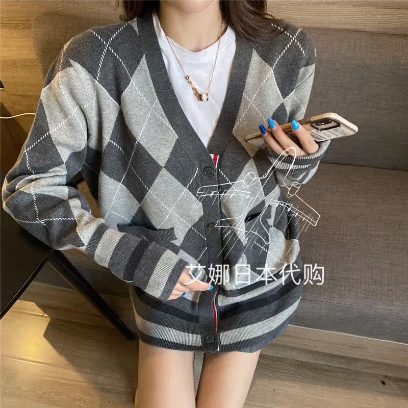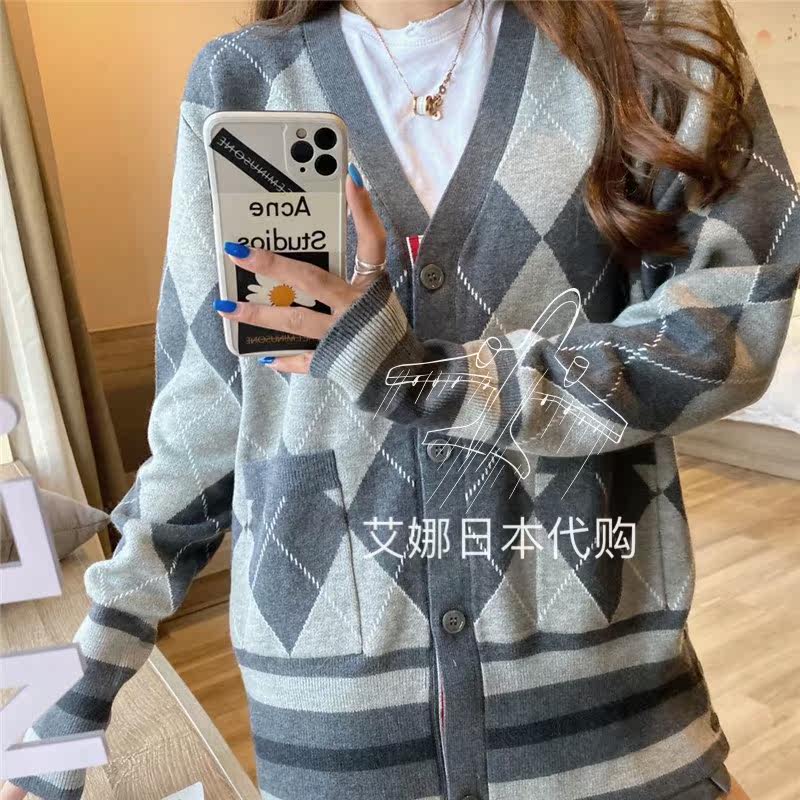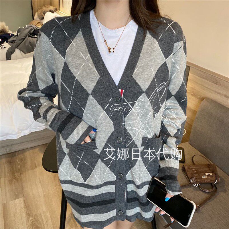 Thom Browne Autumn/Winter 20 TBV-neck diamond contrast color long-sleeved loose-fitting knitted cardigan jacket