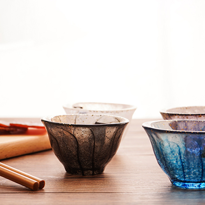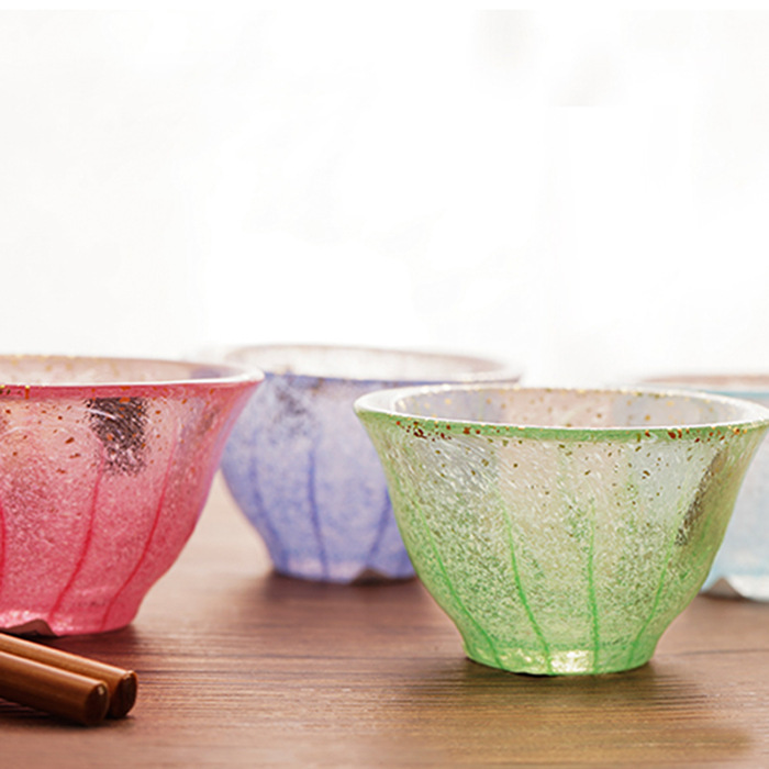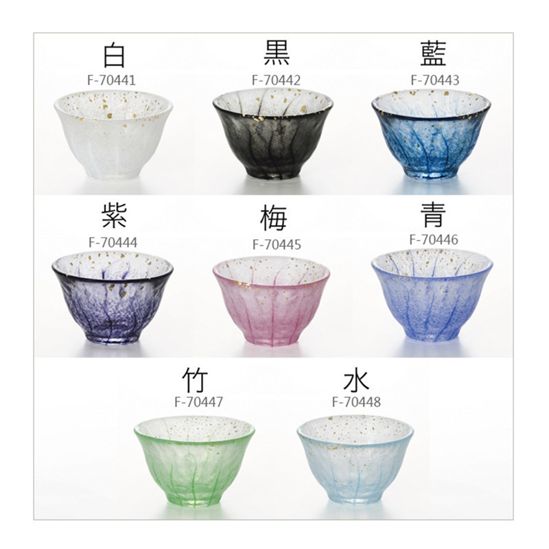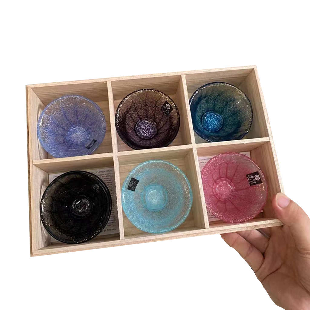 White (white dew) black (blue snow) purple (violet) red (lame) green (cold dew) green (cuisaki) pale blue (clear water) two wooden boxes (need and cup)