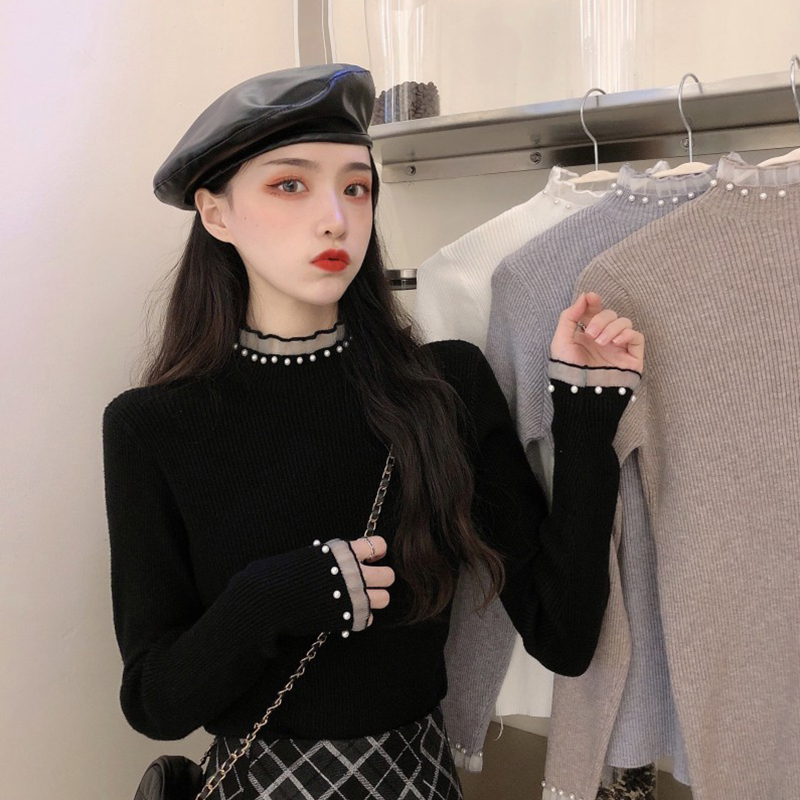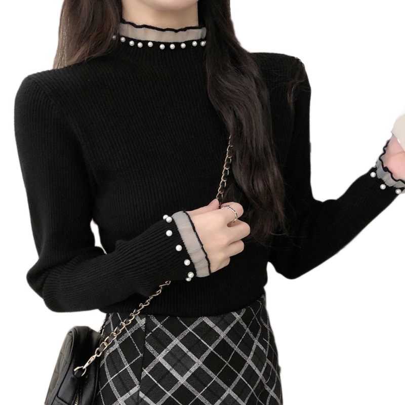 Autumn Winter New Heavy Engineering Nail Pearl Knit Undershirt Woman Half High Collar Inner Hitch Long Sleeve Design Sensation Foreign Pie Jacket