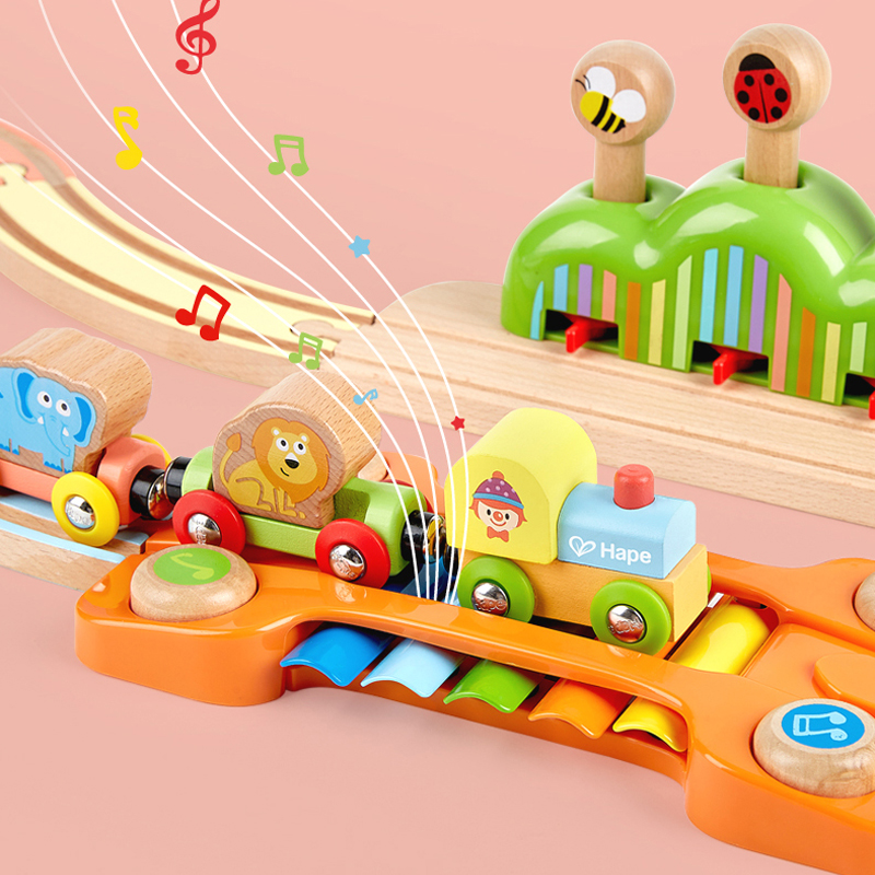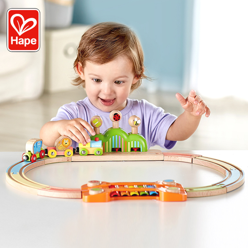 Hape children's small train track toy wooden music set baby electric model assembly building block golden baby