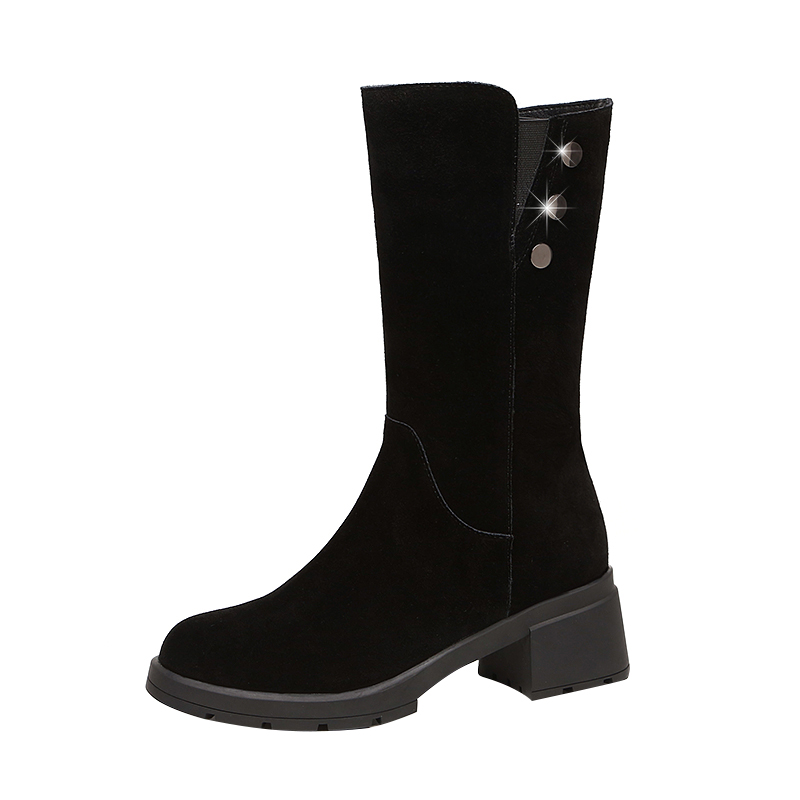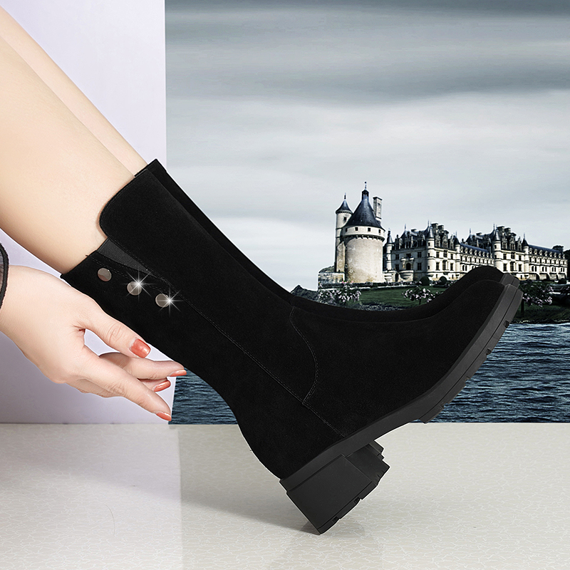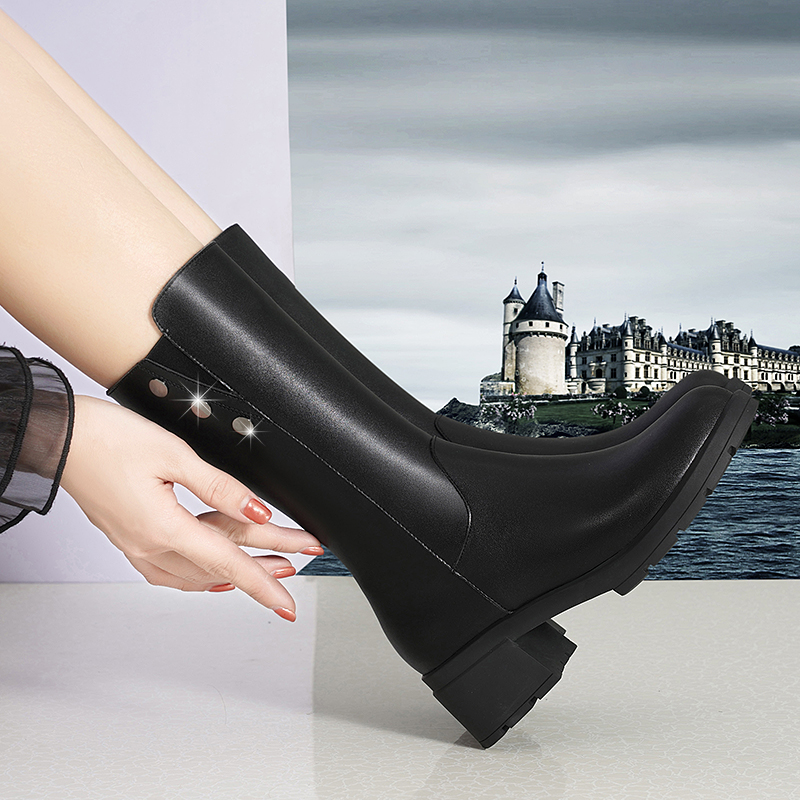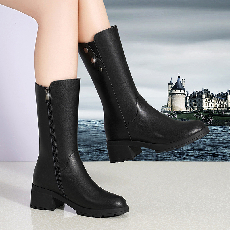 Jinte Belle leather mid-well boots women's velvet warm 2022 new winter thick-heeled Martin boots long boots