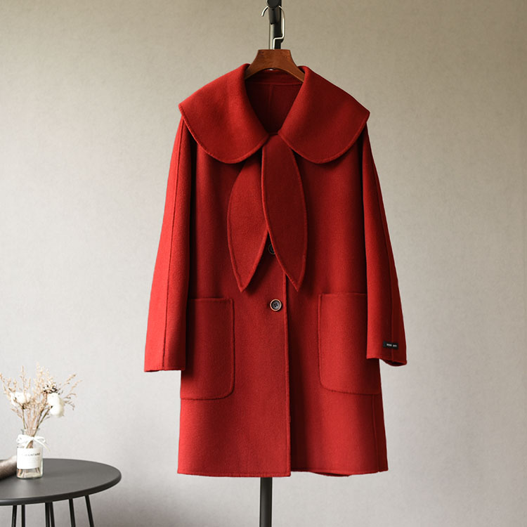 New rabbit ears butterfly knot with long version of double sided wool, woman loose with zero cashmere autumn and winter young coat