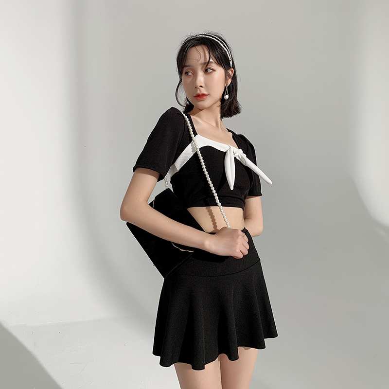 Princess Surana split swimsuit female conservatively shows a three-piece skirt type short sleeves black hot spring swimsuit