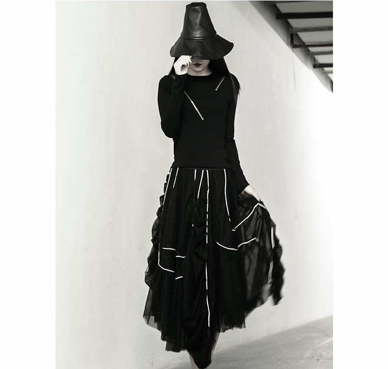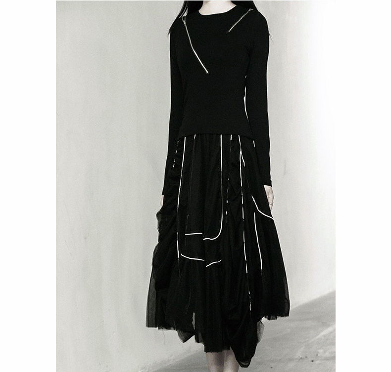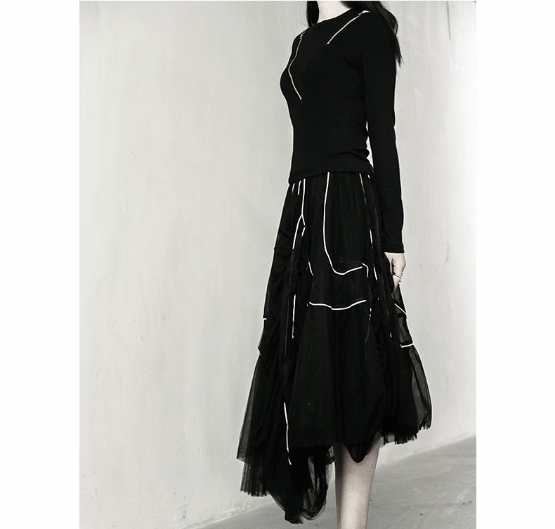 Dark Black Ensemble Mountain Bendazzle Small Crowdvanguard Day Style Irregular Hierarchy Stacking Sensual Black-and-white Color Mesh Yarn Half Skirt