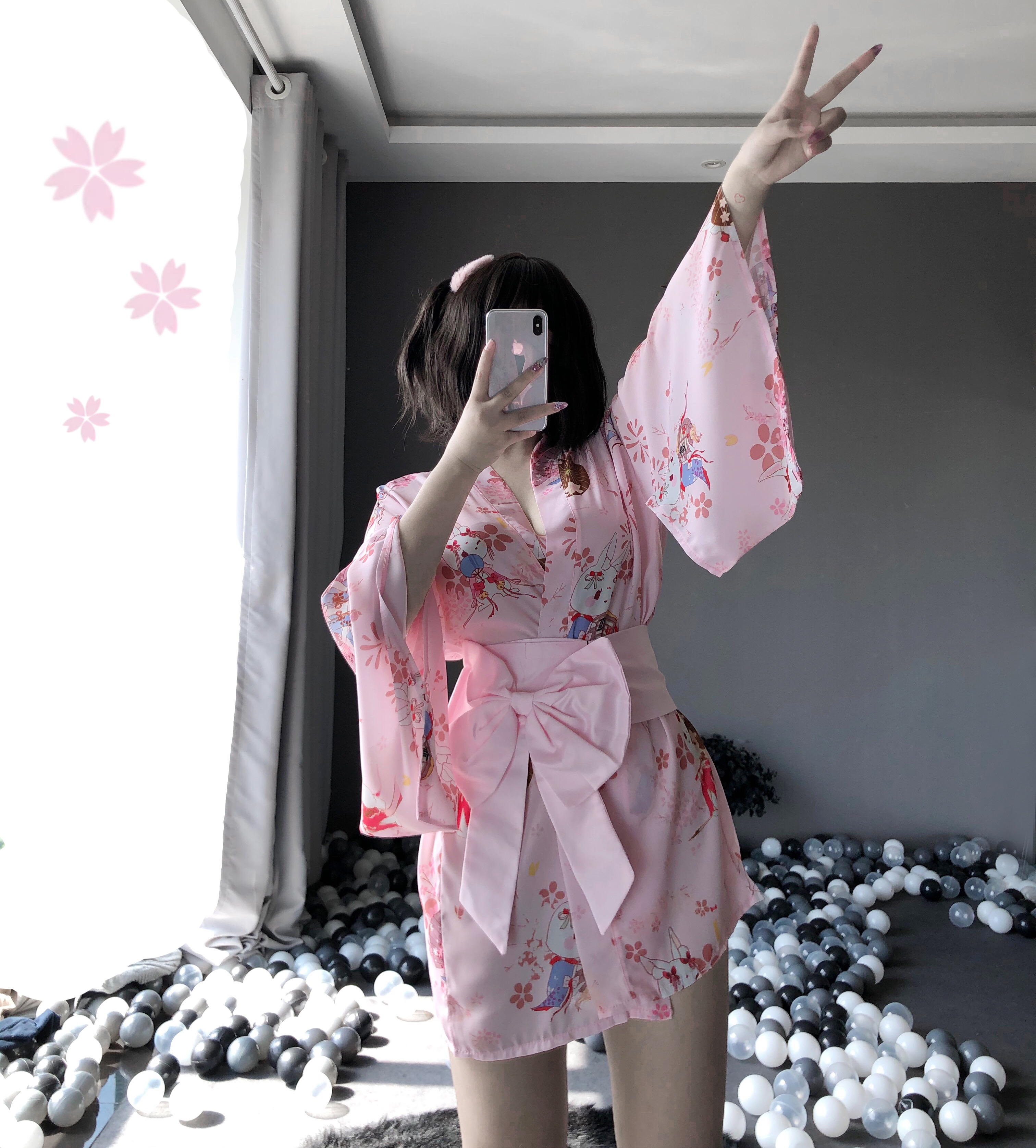 Japanese kimono cos cute anime cherry cat girl ancient style yukata big bow waist seal temptation home service