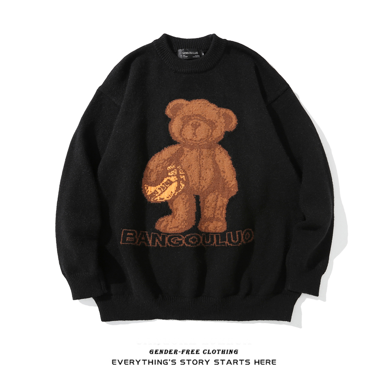 ZOROHOM bear jacquard round neck sweater women and men loose large size ins Hong Kong flavor long sleeve base sweater sweater sweater