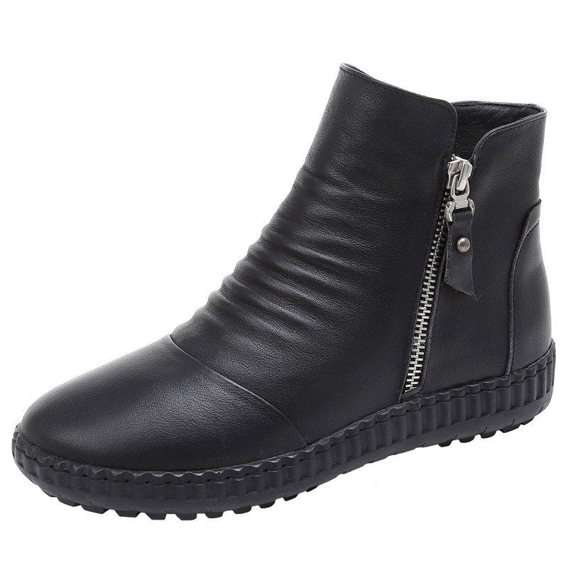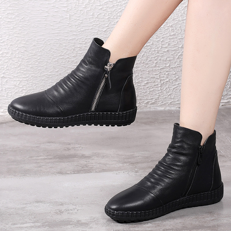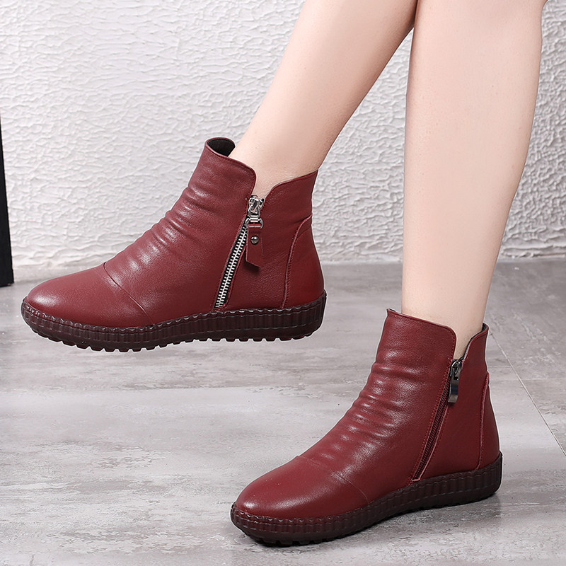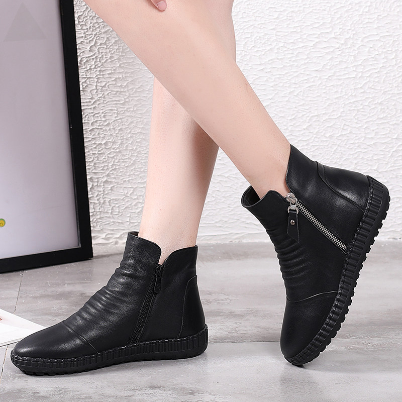 Autumn leather flat bottom plus velvet soft leather mother shoes short boots round toe side zipper soft bottom Martin boots female large size 41 a