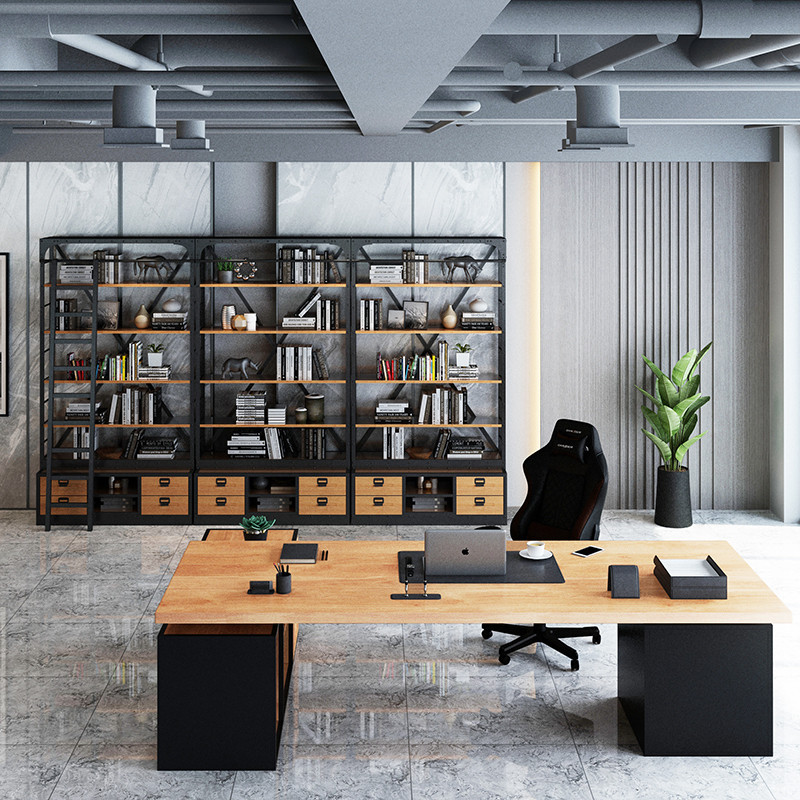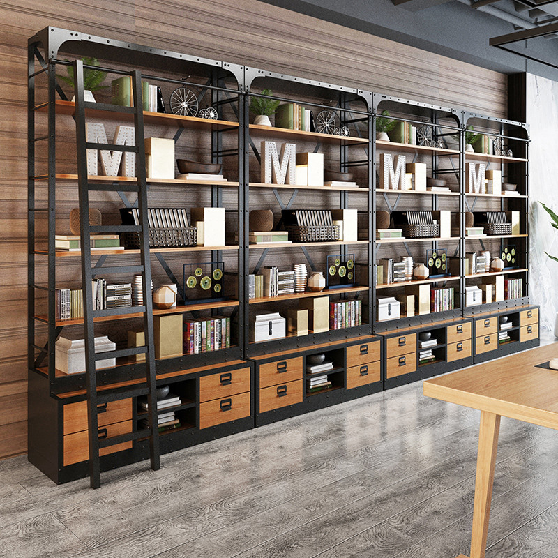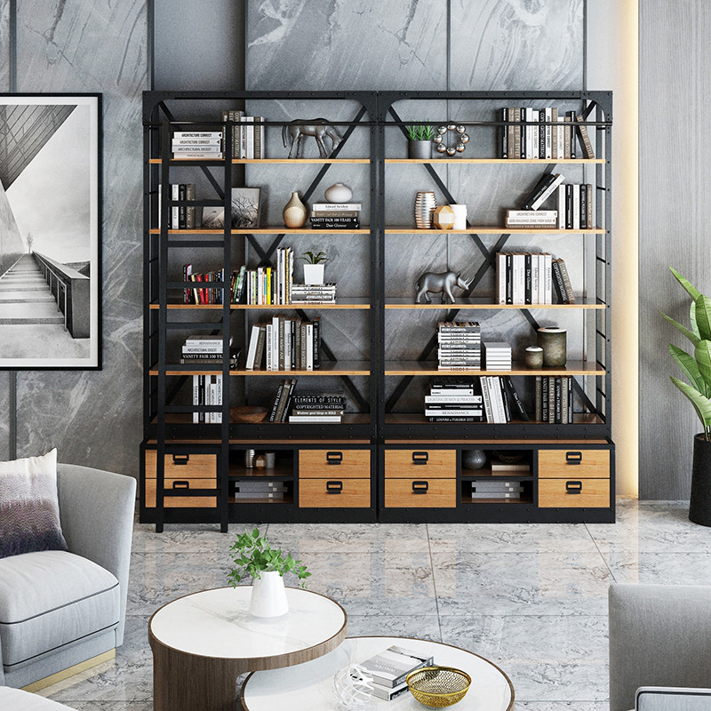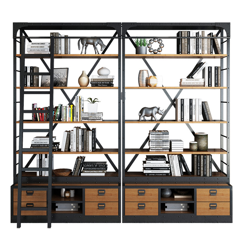 Loft American industrial style wrought iron bookshelf rack floor multi-layer solid wood living room storage full wall bookcase customization